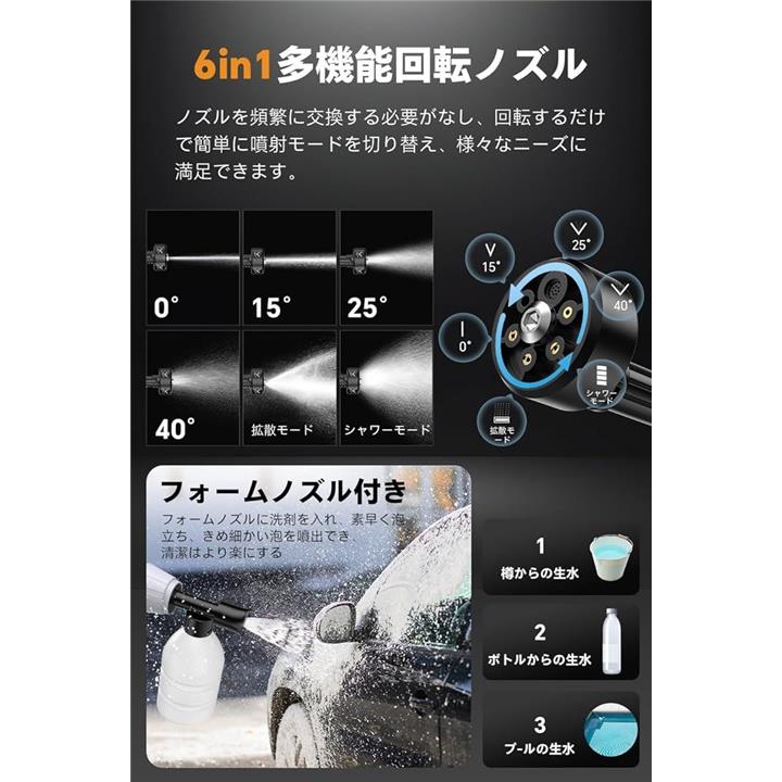 「6-in-1多機能ノズル&泡のボトルノズル&18種類モード調節可」高圧洗浄機はオプションパーツは豊富で、6-in-1多機能ノズルは、0°、15°、25°、40°、拡散モード噴射、シャワーモード噴射6つの異なる噴射モードを切り替えることができ、高圧洗浄機の3段階水圧調節機能を組み合わせて、18種類の洗浄モードを実現。