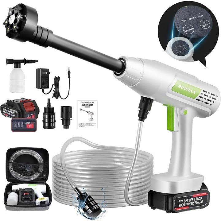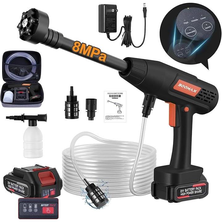 「互換品」Boomax高圧洗浄機 コードレス USB充電式 3段階水压モード 約18モード調節可能 安全ロック機能搭載 ボタン長押し不要 6in1多機能ノズル フォームノズル 自吸式 8MPa吐出圧力 噴射距離10M 洗車店監修 収納ケース付き |
