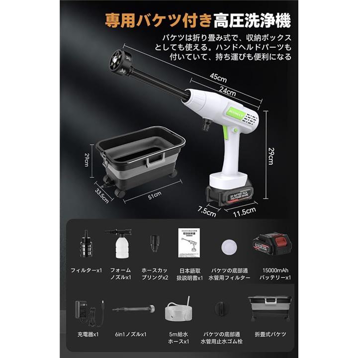 パッケージには、日本語取扱説明書x1、コードレス高圧洗浄機本体x1、互換可能な15000mAhバッテリーx1、電源アダプタx1、給水ホース(5m)x1、6in1多機能ノズルx1、フォームノズルx1、給水フィルタx1、充電アダプターx1、折り畳み式バケツx1、ホースカップリングx2が含まれています。