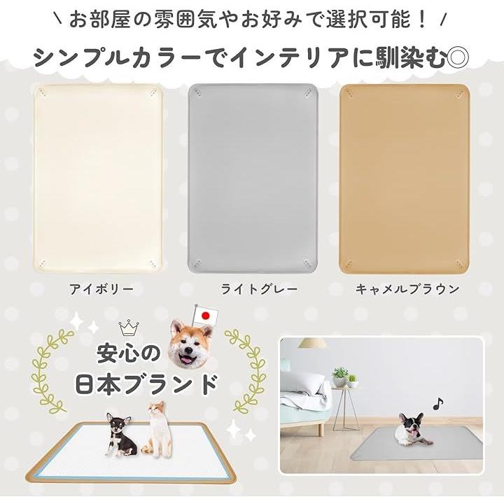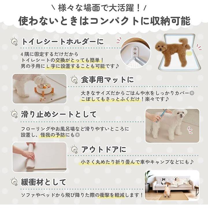 シリコンマットは裏表ともに滑りにくい素材を採用しており、トイレシートや食器がズレにくい。足上げするワンちゃん用にL字にして壁際に設置することも可能です。