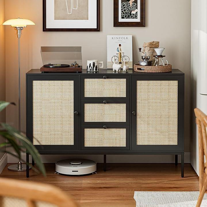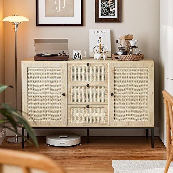 IKIFLY ラタンキャビネット 木製 サイドボード 3扉 チェスト リビングボード 収納棚 おしゃれ リビングルーム ダイニングルーム 寝室用 |