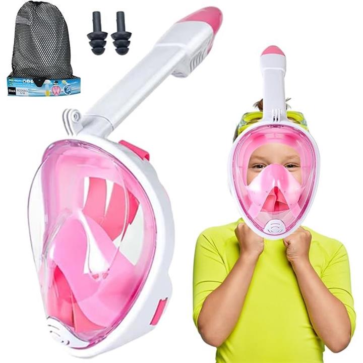 「セット内容」シュノーケルマスク+収納袋+耳栓+カメラ取付部品「カラー」ブラック/グリーン/ブルー/ピンク「サイズ」XS(子供用)「機能・特徴」フルフェイス/180°広角視野/大型レンズ/曇り止め/浸水防止/カメラ取付可能