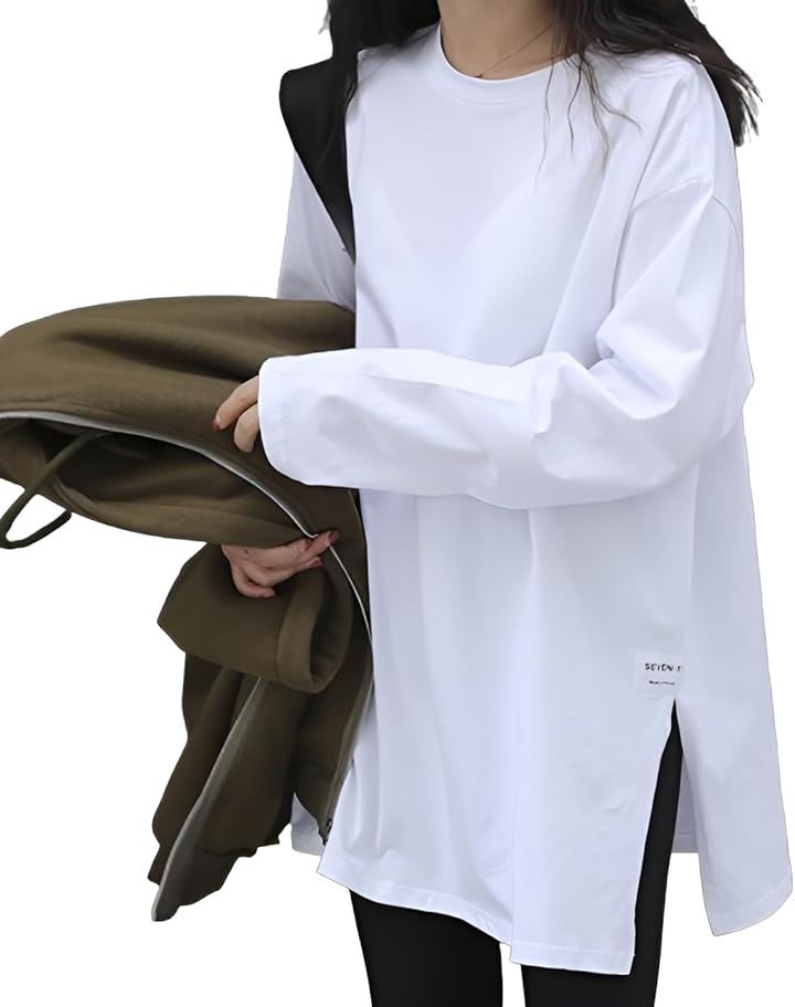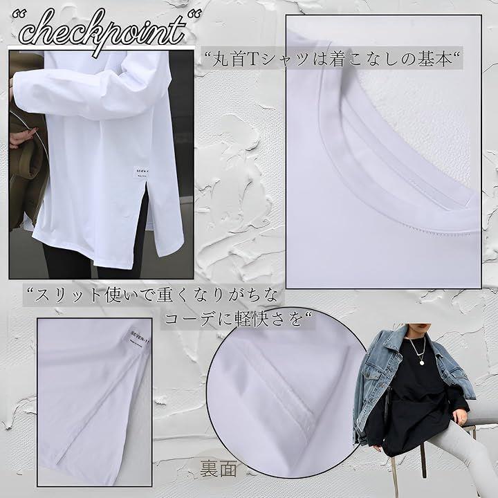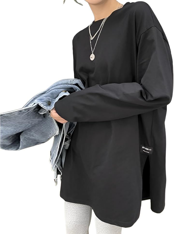 長袖 Tシャツ レディース ゆったり ロンT 無地 韓国 スリット カットソー オーバーサイズ トップス 薄手 大きい 黒 白 Uネック 夏 春 秋