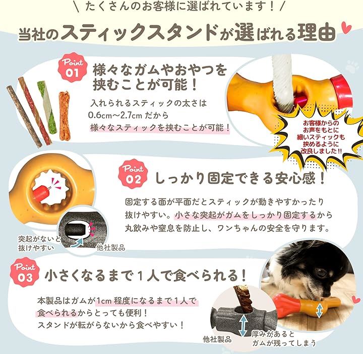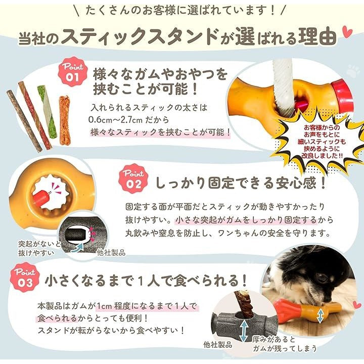 「類似品との違い」スティックを固定する面が平面だと動きやすかったり抜けやすく丸飲みによる窒息の危険が伴いますが、小さな出っ張りがガムをしっかり固定するため、ワンちゃんの安全を守ります。