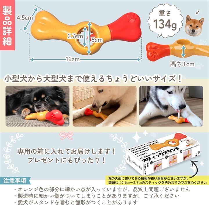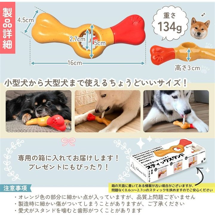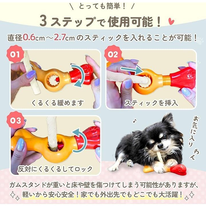 0.6cm~2.7cmのスティックをしっかり固定できます。愛犬が噛んでも壊れにくい頑丈な素材を採用。*本品はおやつを挟む玩具であり、嚙むおもちゃではありませんので、嚙む力が強い子には気を付けてお使いください。