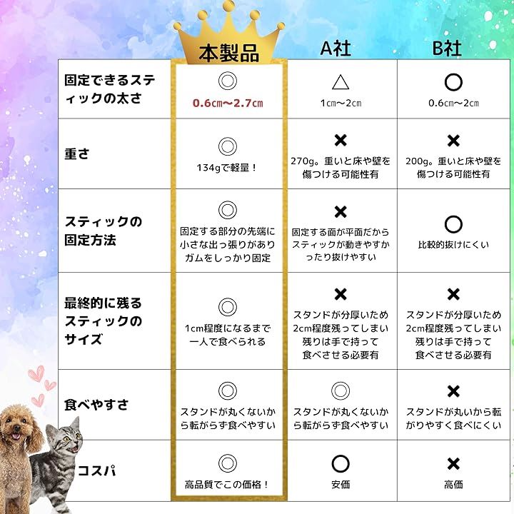 「スティックが小さくなるまで1人で食べられるガムスタンド」スティックホルダーの高さが高いとホルダー内にスティックが残ってしまい、結局最後の残りは手で持って食べさせる必要がありますが、本製品は1cm程度になるまで愛犬が一人で食べられるからとっても便利。また、スティックホルダーが転がらないから食べやすい。重いと床や壁を傷つけてしまう可能性がありますが、本製品はたったの134gで軽いから様々な犬種におすすめです。