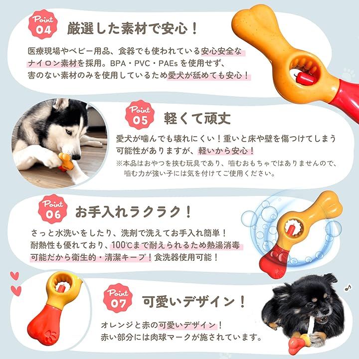 ポイント(5)軽くて頑丈 愛犬が噛んでも壊れにくい。重さがあると床や壁を傷つけてしまう可能性があるが、軽いから安心。 *本品はおやつを挟む玩具であり、嚙むおもちゃではありませんので、嚙む力が強い子には気を付けてお使いください。