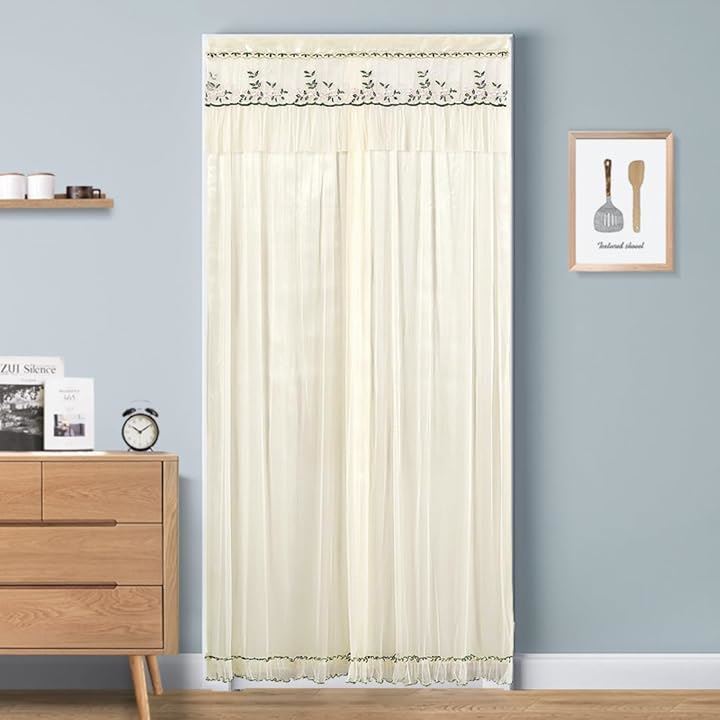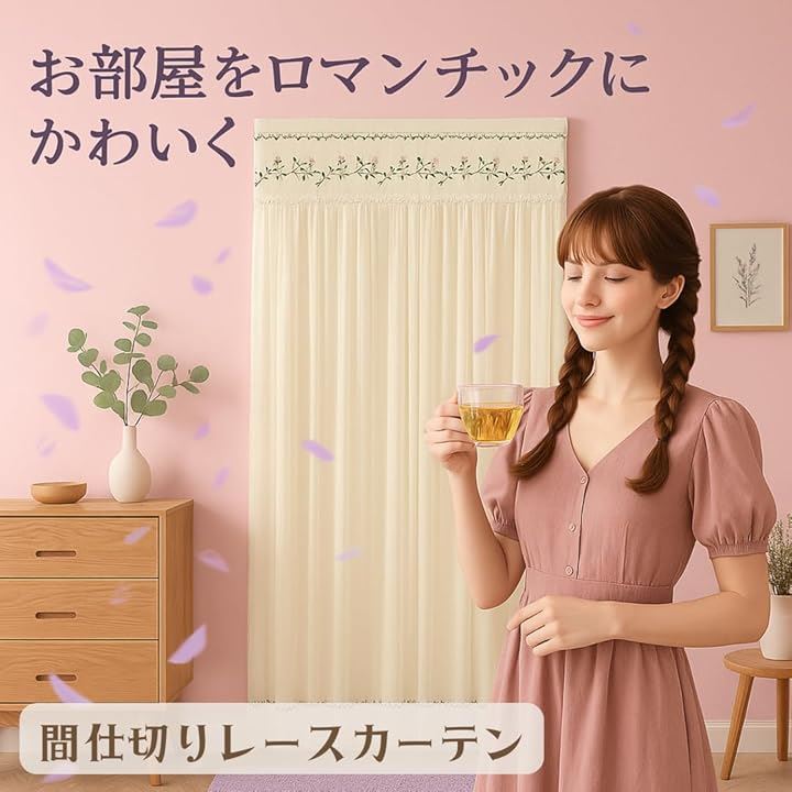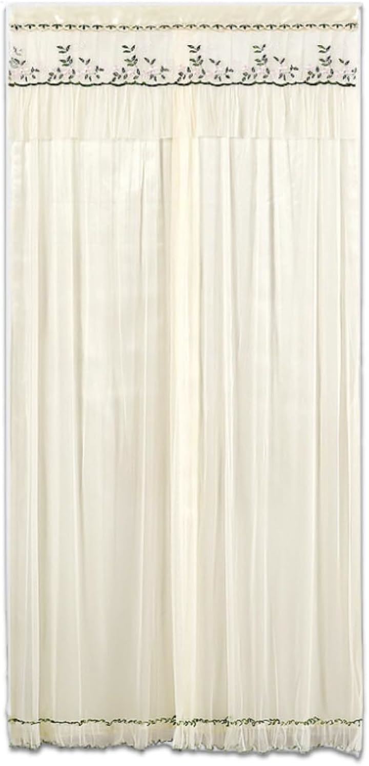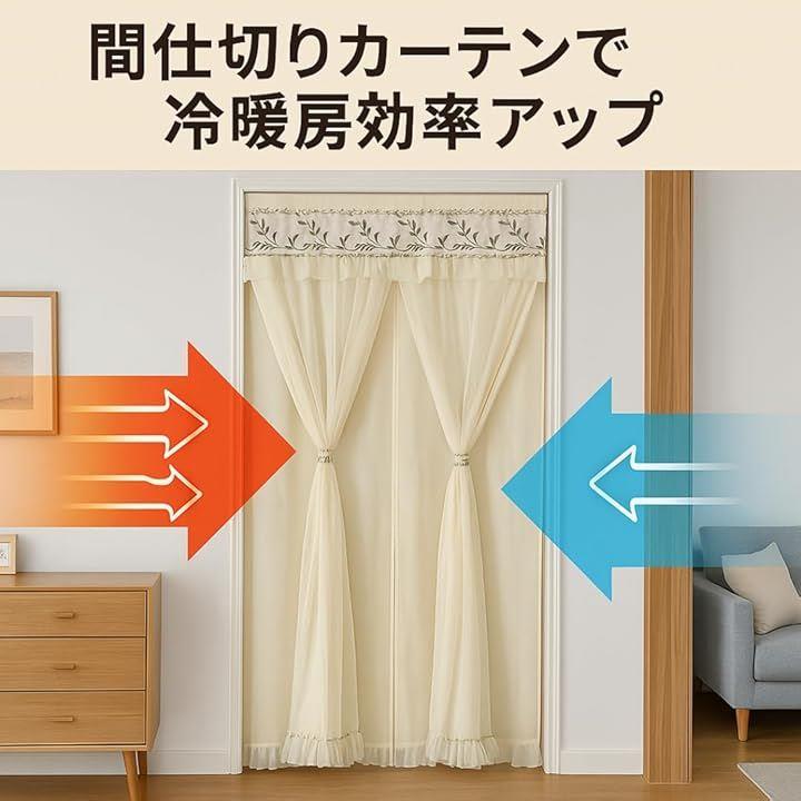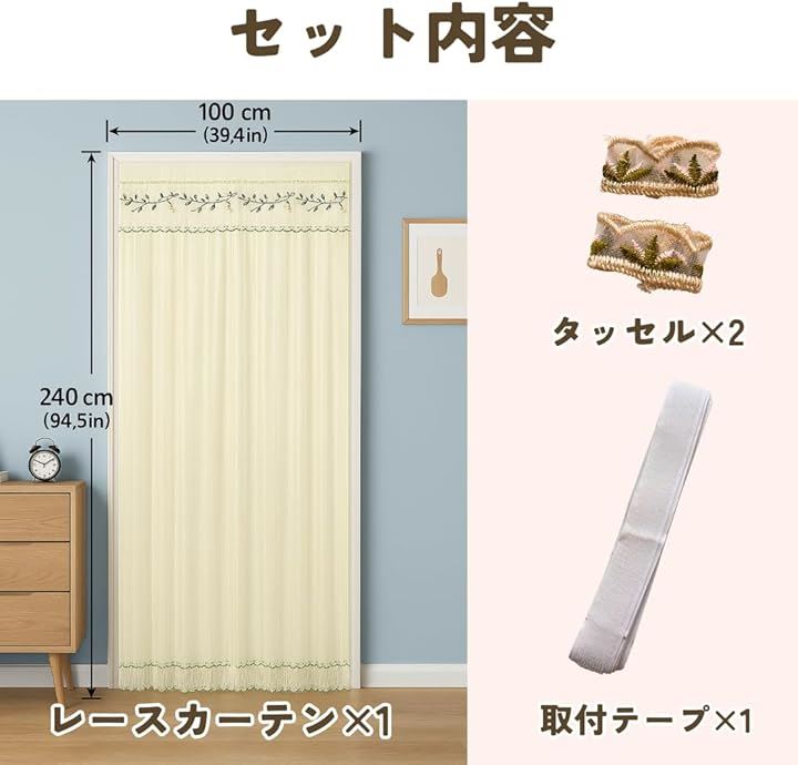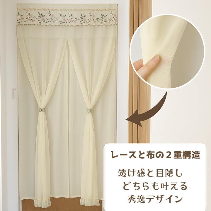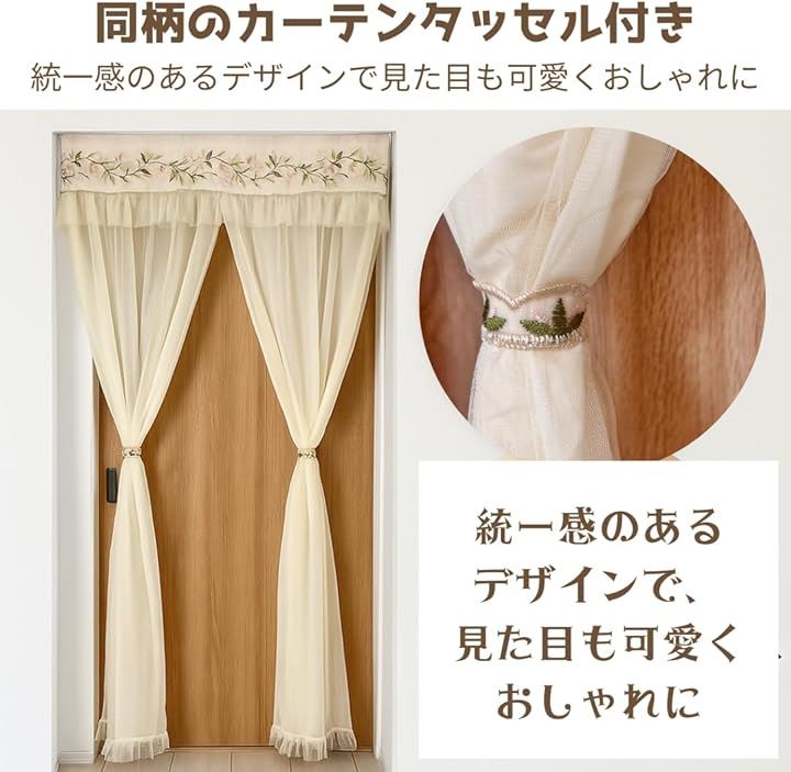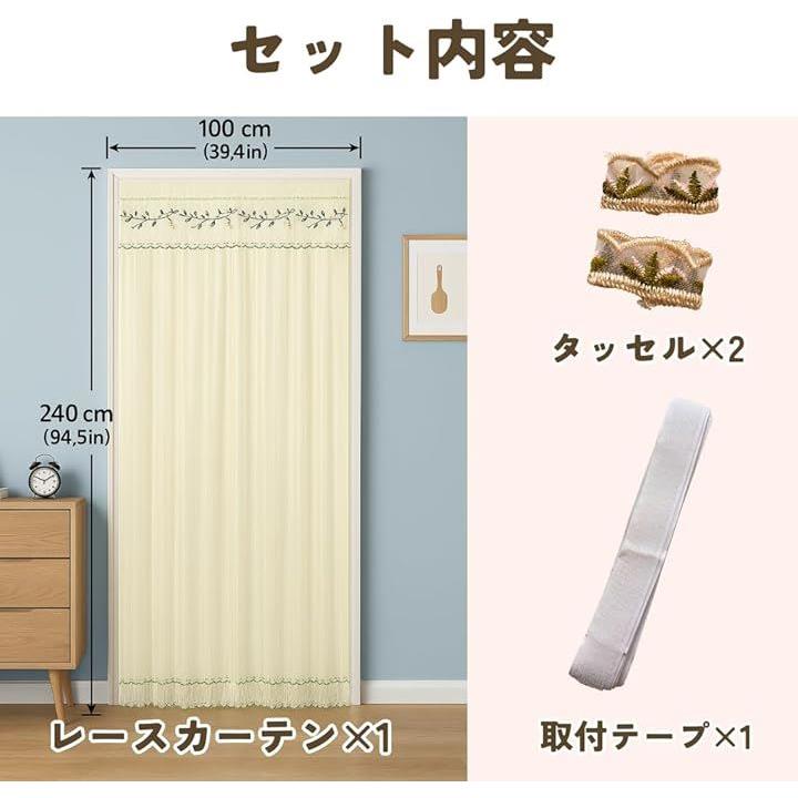 間仕切りレースカーテン 幅100cm 丈240cm2重構造 同柄タッセル付き のれん 透け感 目隠し 刺繍付き ドアカーテン パーティション 冷暖房対策