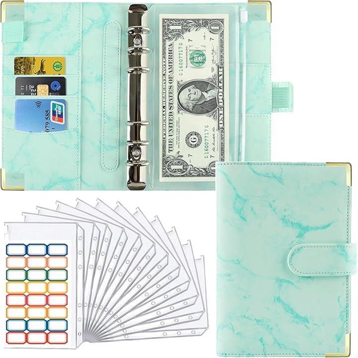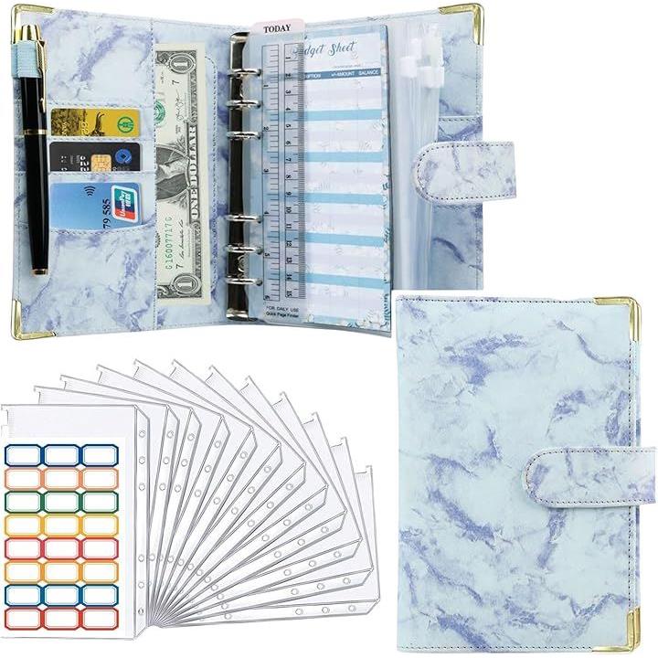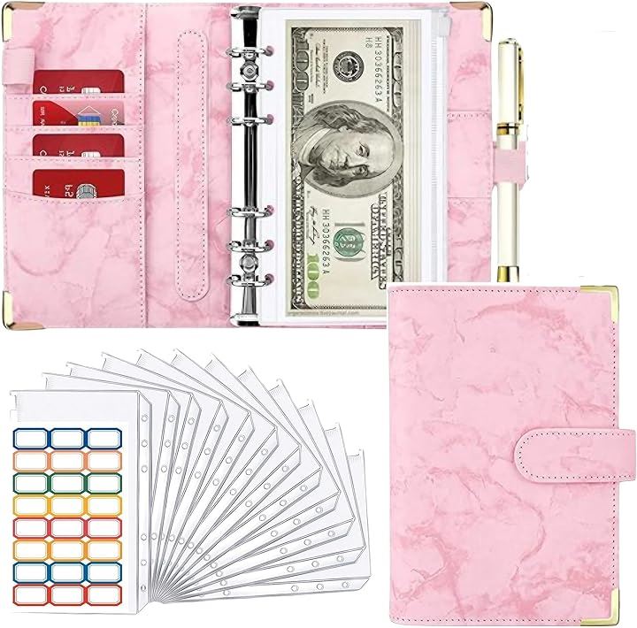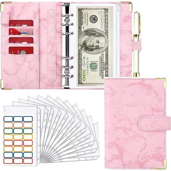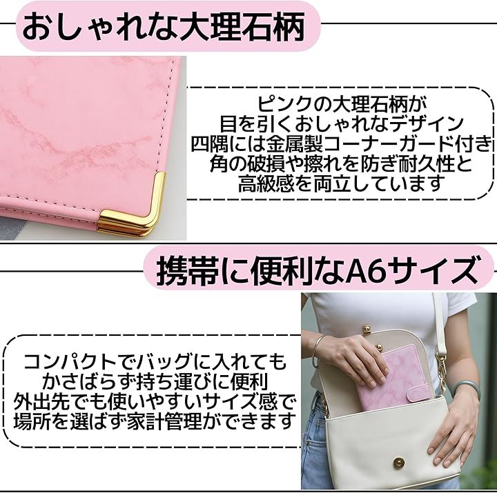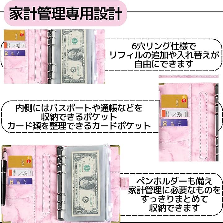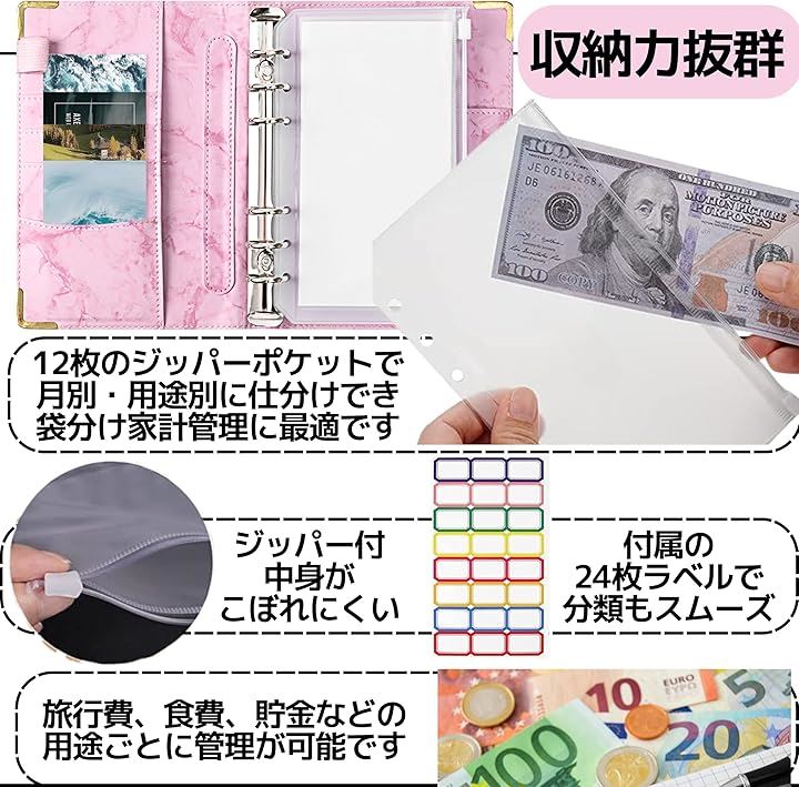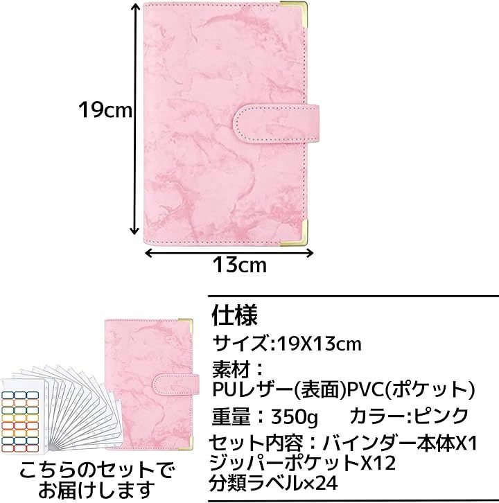 家計管理 予算バインダー A6 大理石柄 ファイル 6穴 袋分け 12ポケット ラベル24枚付き ピンク