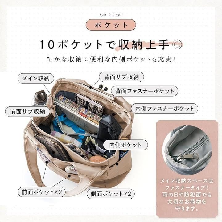 「仕様」 メイン開閉:ファスナー式/ポケット:合計10個(内外含む)/用途:通勤・通学・マザーズバッグ・旅行など幅広く活躍。