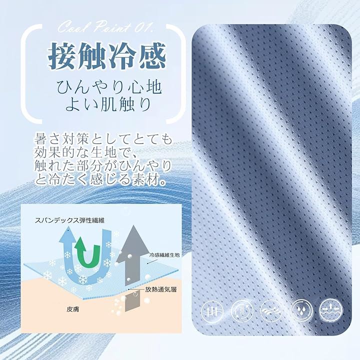 「涼感素材」KM 3.0(機能性涼感生地) 特殊涼感素材の使用により、人体などから発生する余分な水分に反応し、生地に隣接する周囲の熱を吸収。