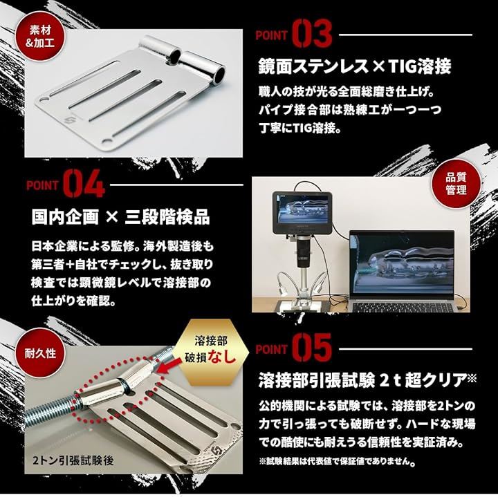 「公的機関が証明した、プロ仕様の溶接強度」 公的試験機関での引張試験では、2トンを超える荷重をかけても溶接部は破断せず。