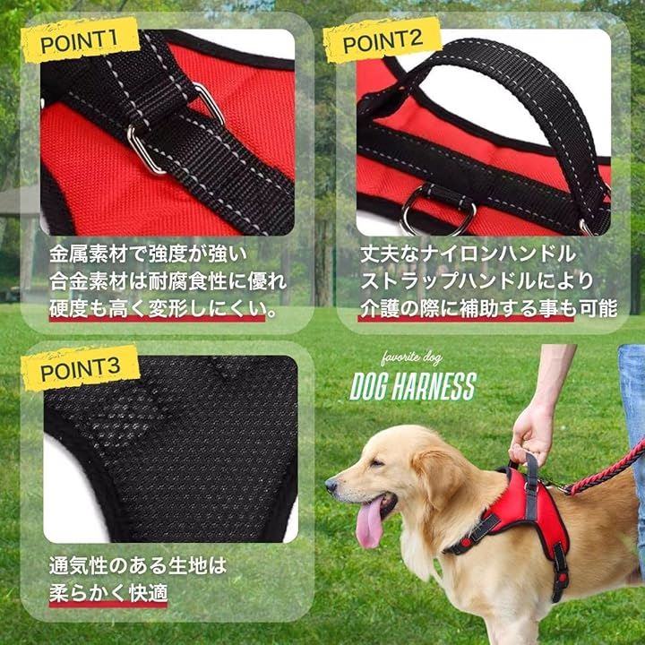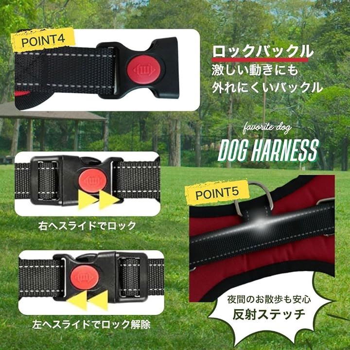 この犬用ハーネスは、肩回りと胸回りの2カ所でしっかりホールドする設計で、急な飛び出しや他の犬との接触を防ぎ、安全を確保します。