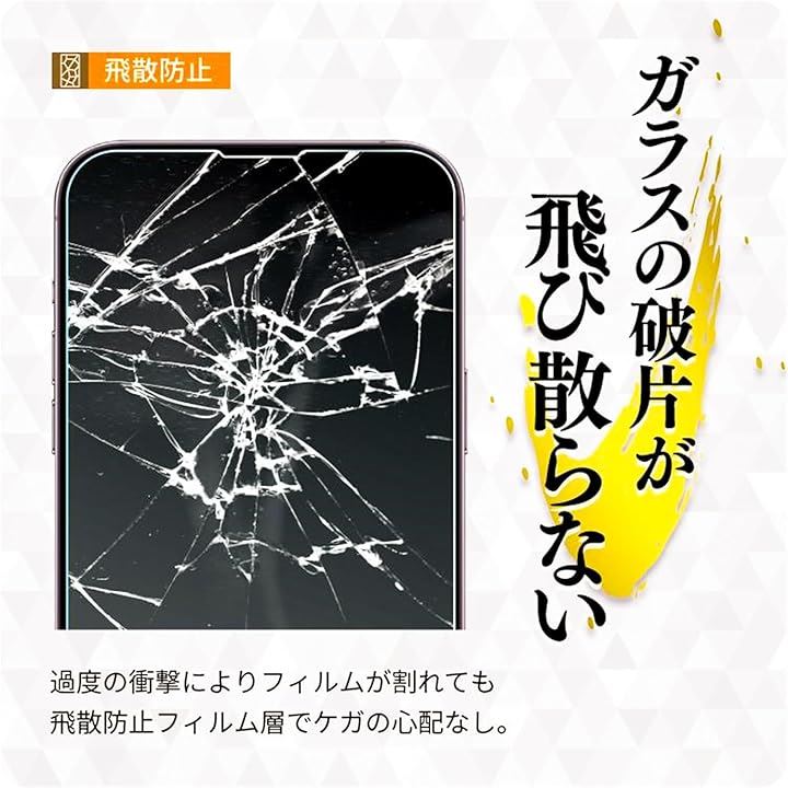 「硬度9H越え・耐衝撃性」旭硝子の素材を採用した、硬度9Hの、ハードコート技術を活用し、保護フィルムが外部からの衝撃力を吸収し、画面の損傷を抑える。