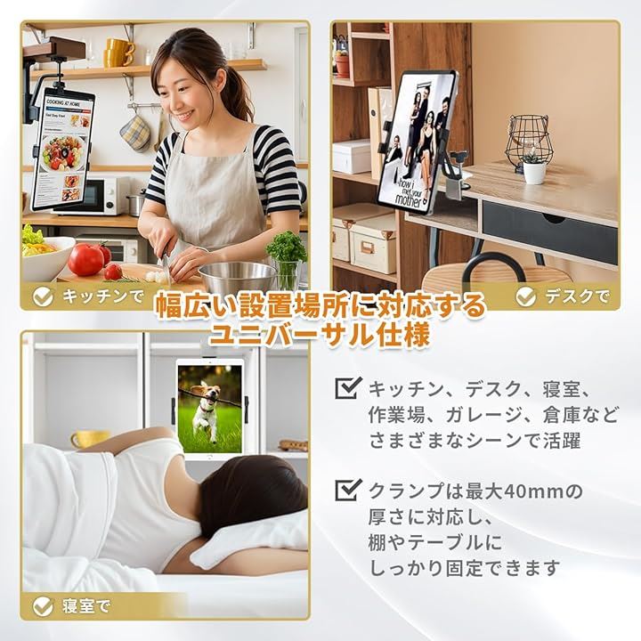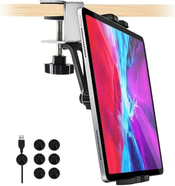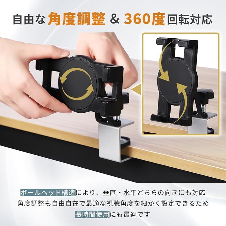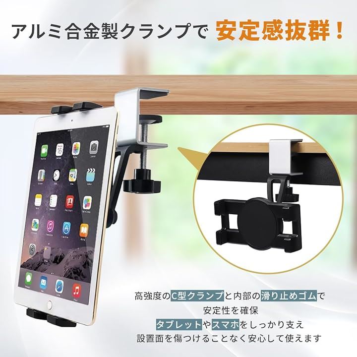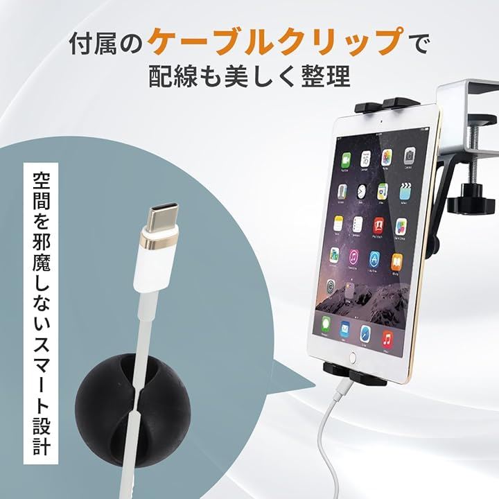 タブレットスタンド クランプ式 アーム 角度 調整 360度 回転 卓上 対応 スマホ iPad 4~13 インチ ケーブル クリップ付