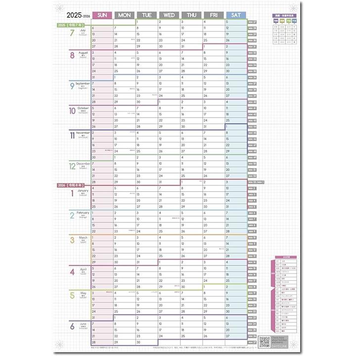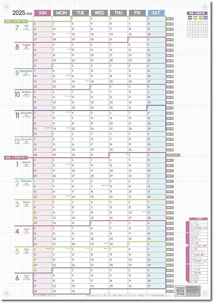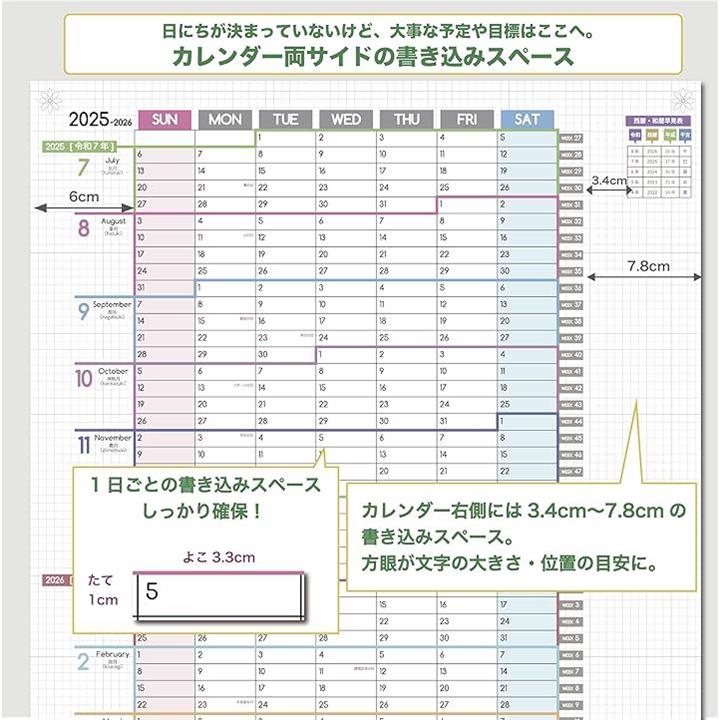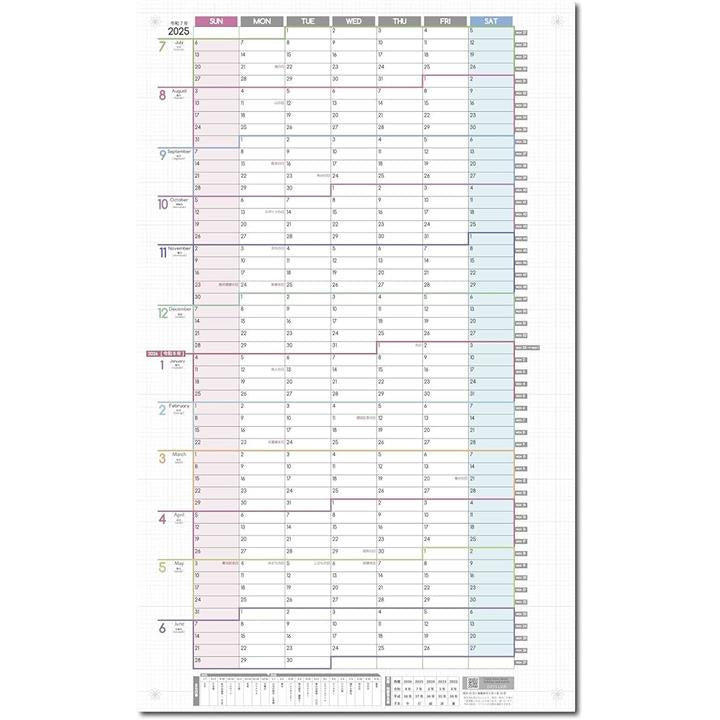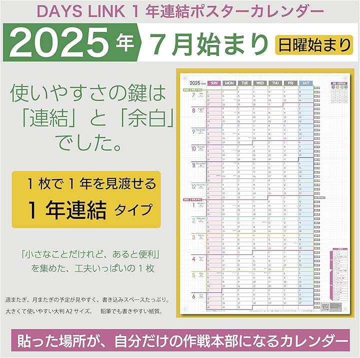1年連結カレンダー ポスター 1枚 2025年 7月始まり 日曜始まり 大きい 壁掛け 令和7年 1Y-25-07SUN