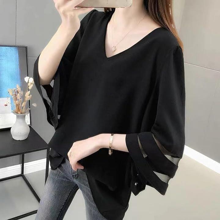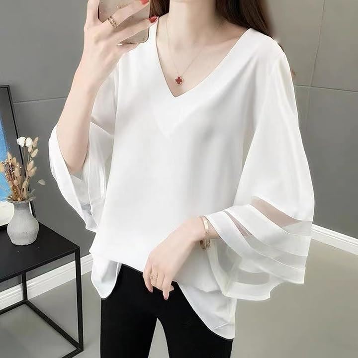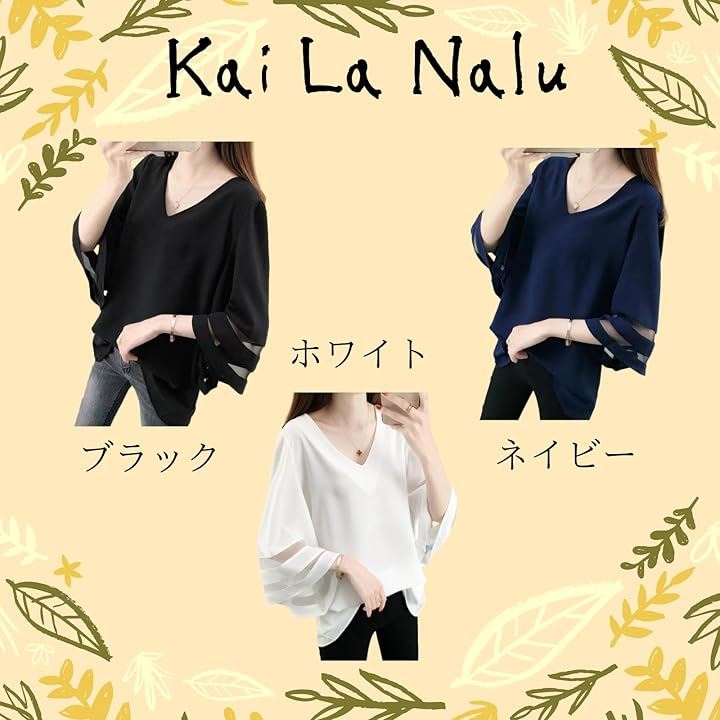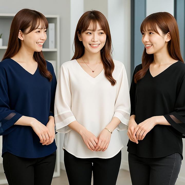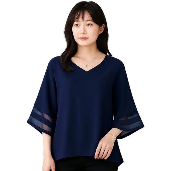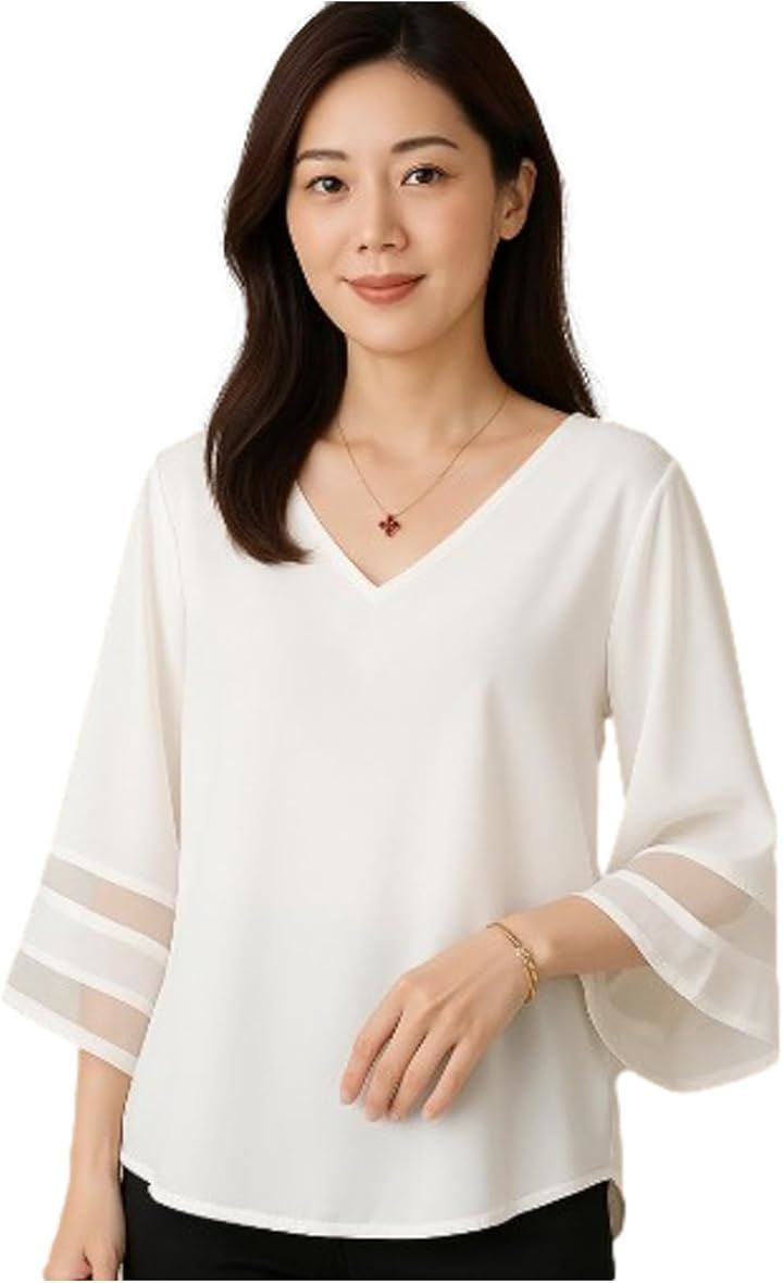シフォン ブラウス Vネック ゆったり スリーブ トップス レディース シフォンブラウス オフィス カジュアル 体型 カバー 大人女子 ファッション 透け感 袖 春 夏 秋 きれいめ 二の腕カバー 通勤服 フェミニン コーデ シースルー袖 可愛い