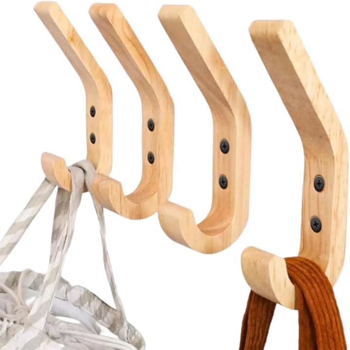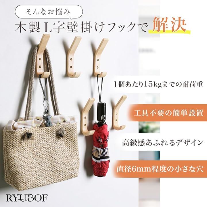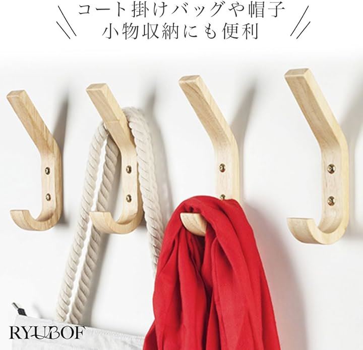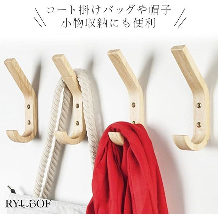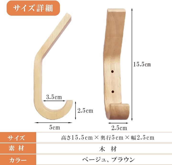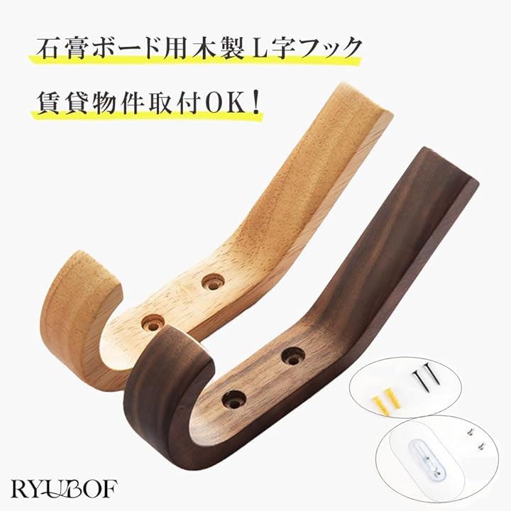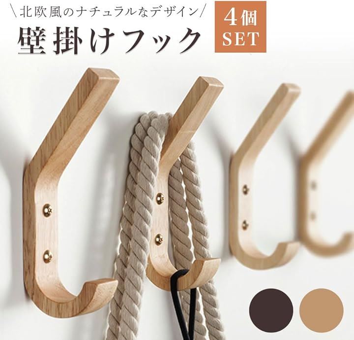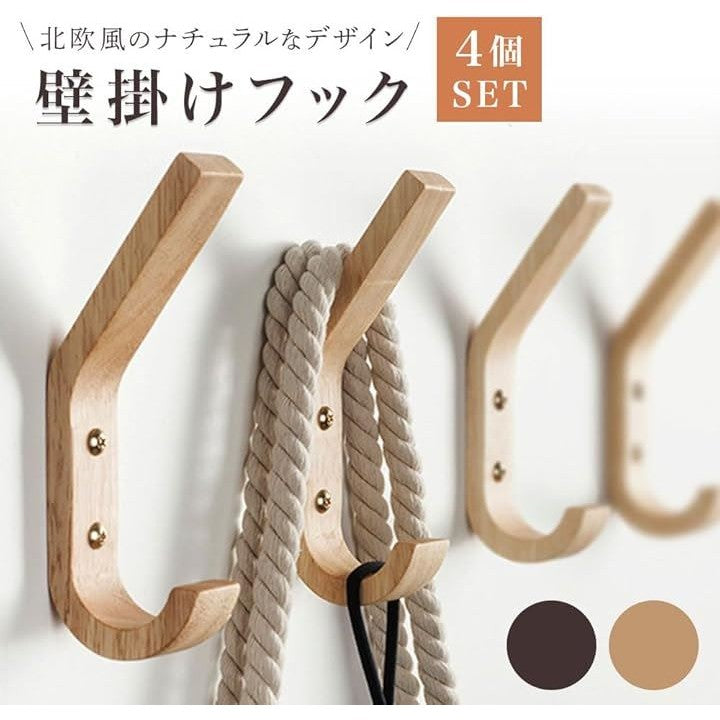 壁掛けフック 石膏ボード用 木製 L字フック ウォールナット 4個セット コート掛け 両用フック 収納