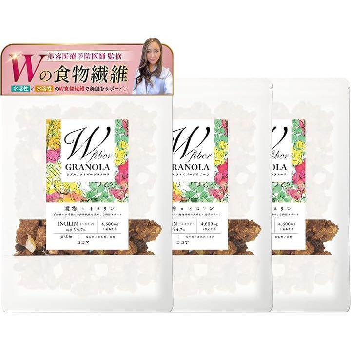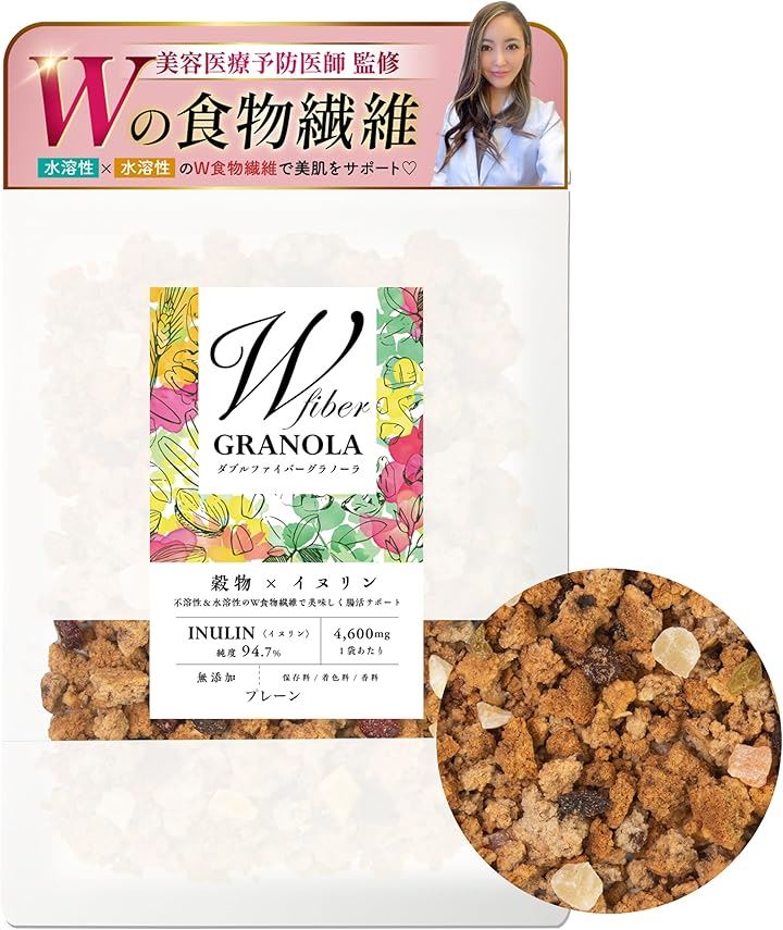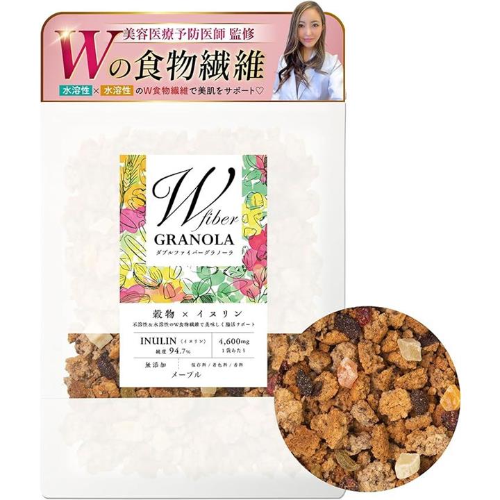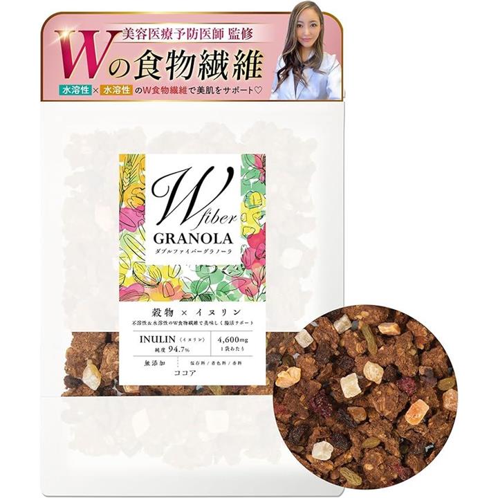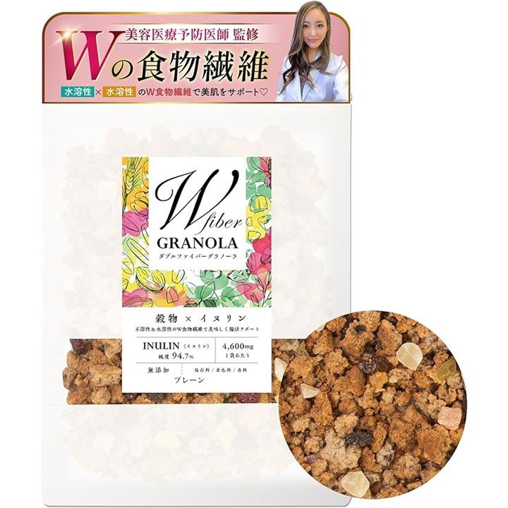「美容医療 予防医学 山下 真理子 医師」「Wファイバー グラノーラは、おからとオートミールに高純度のイヌリンを混ぜ合わせ、不溶性食物繊維と水溶性食物繊維をいっぺんに摂取できる理想的なグラノーラです。