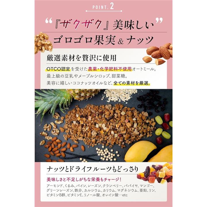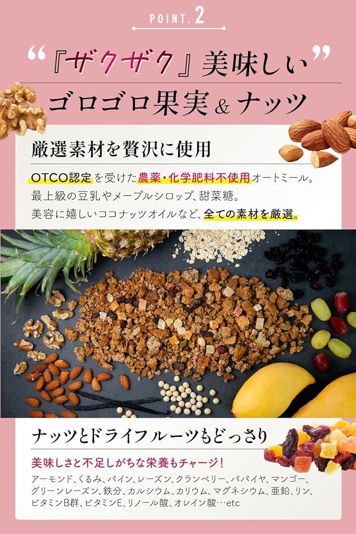 み、ドライフルーツ(パイン、レーズン、クランベリー、パパイヤ、マンゴー、グリーンレーズン)、ココナッツオイル、豆乳、てんさい糖、イヌリン、バニラビーンズ、ヒマラヤ岩塩