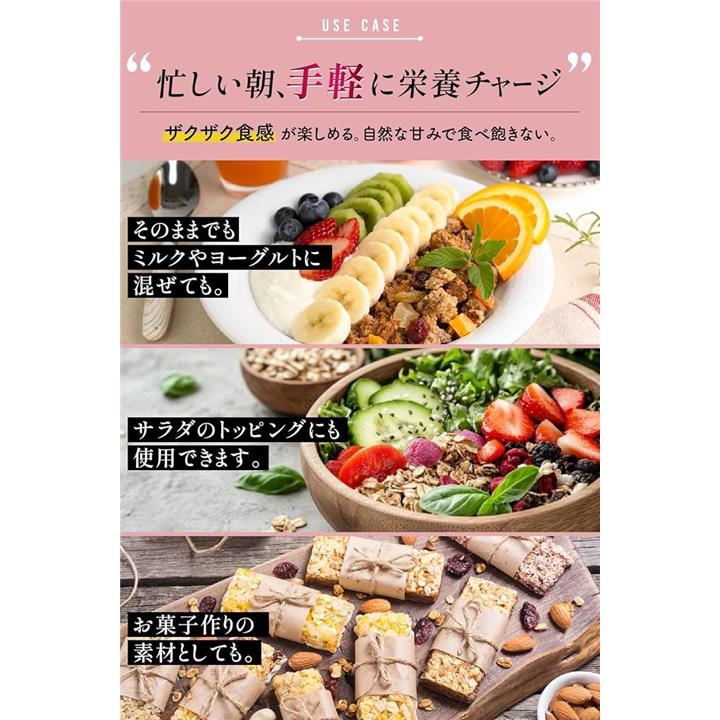 グルテンフリーはもちろん、糖質40%カット(一般的なグラノーラと比較)、ヴィ―ガンにも対応。