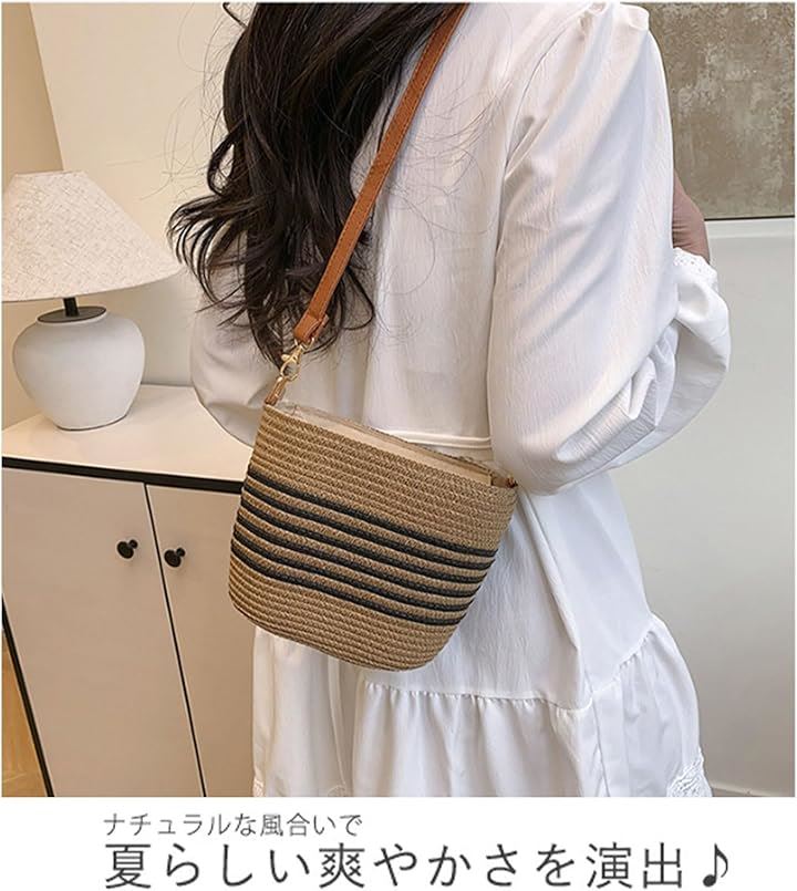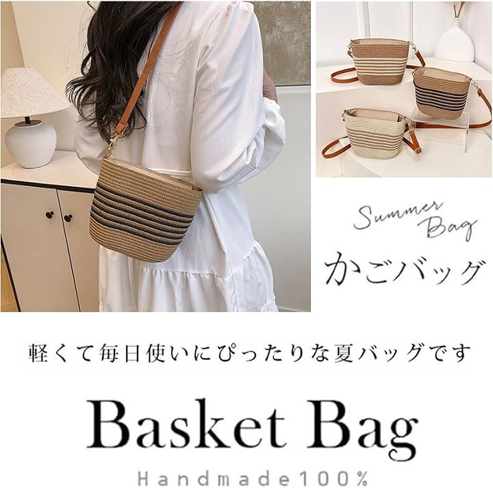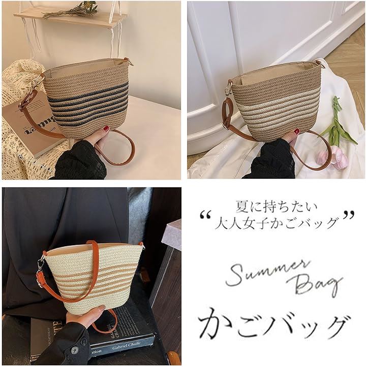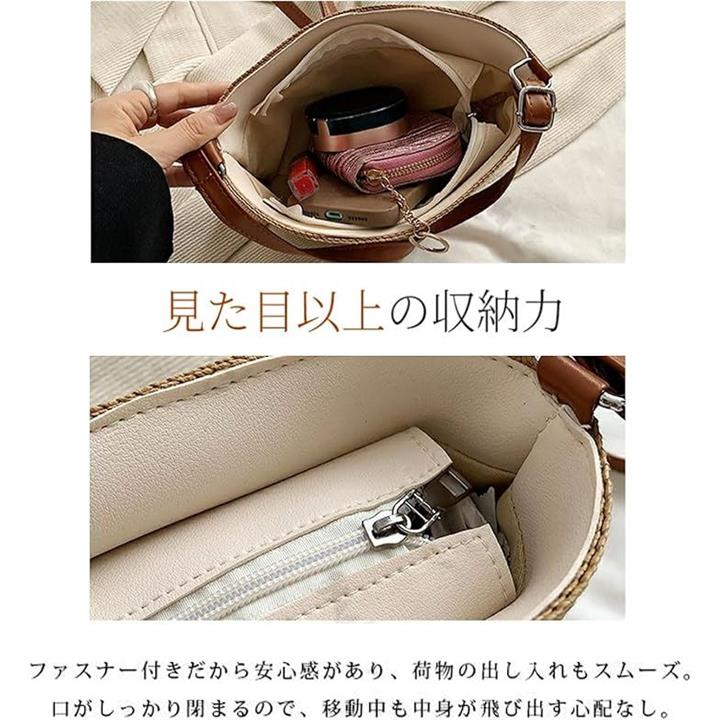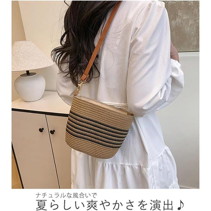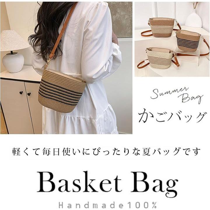 かごバッグ レディース ショルダー ボーダー シンプル カジュアル 大容量 ファスナー 斜め掛け 大人 可愛い サマーバッグ カバン 3カラー 鞄 かばん ハンド 肩掛け 春 夏 旅行 海 ビーチ 軽い 軽量 ポケット ストロー 編み