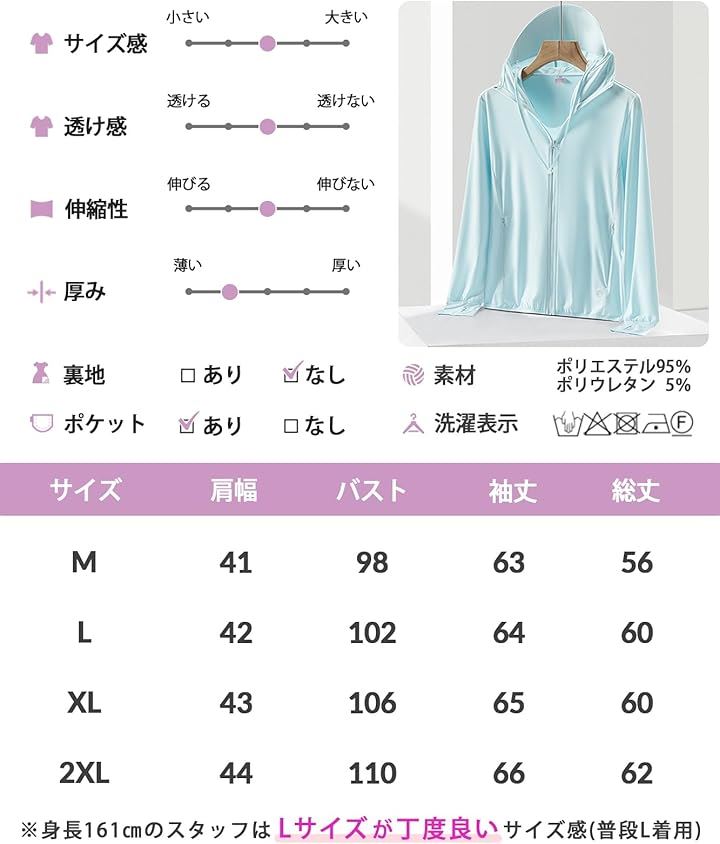 サイズ:肩幅/バスト/袖丈/着丈 「M」41/98/63/56 「L」42/102/64/60 「XL」43/106/65/60 「2XL」44/110/66/62