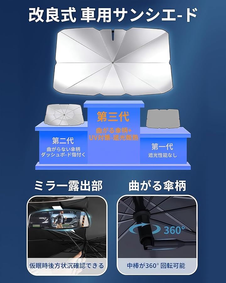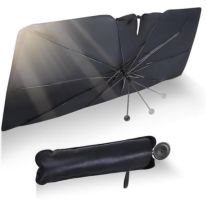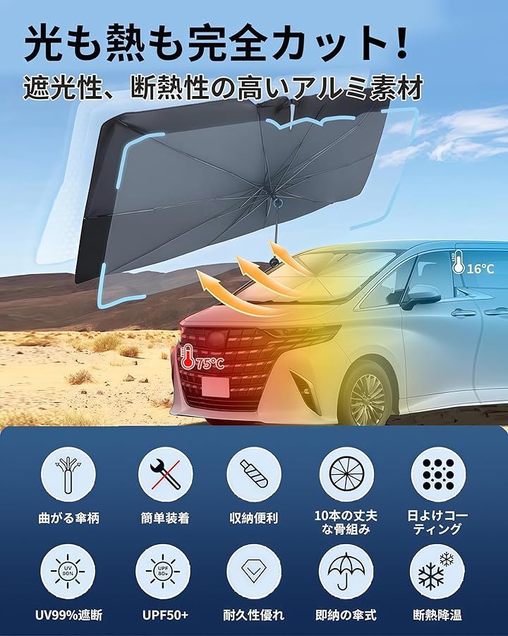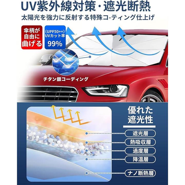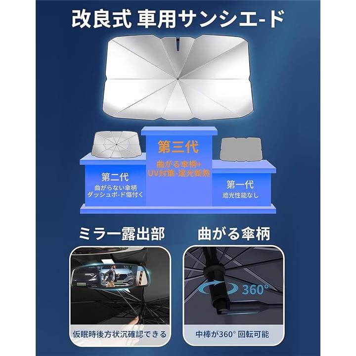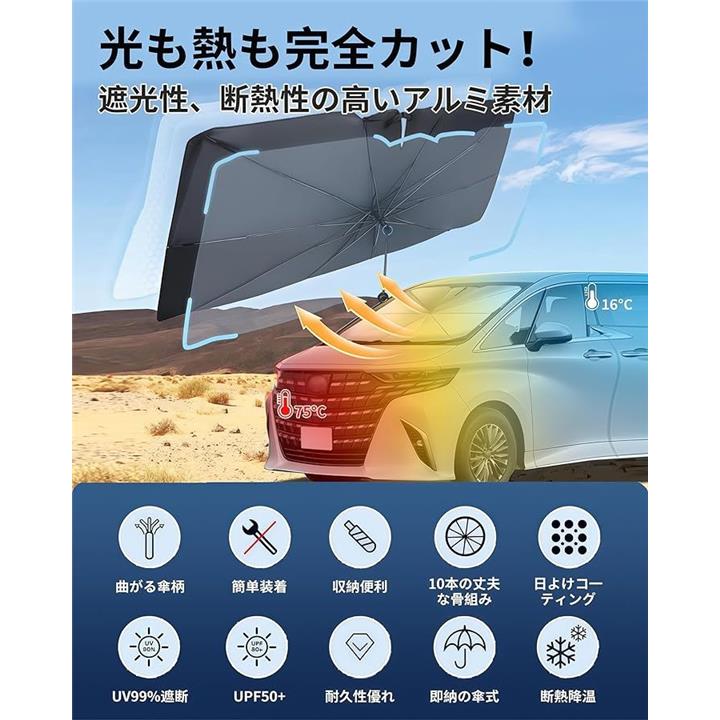 サンシェード 車 フロント 強遮光&高断熱 360°折れる中棒 強化10本骨 車用サンシェード UVカット 折りたたみ式 傘型 フロントサンシェード