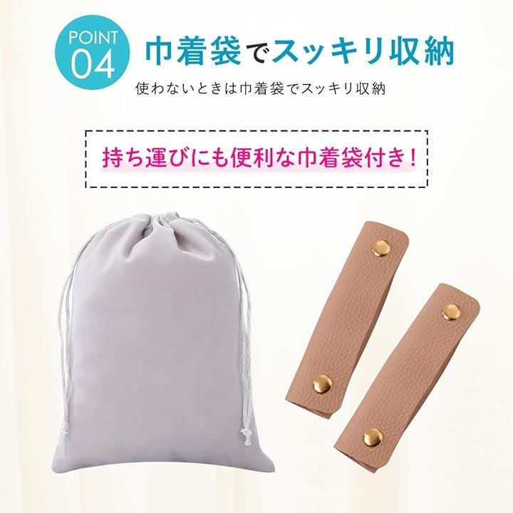 「使わないときは巾着袋でスッキリ収納。 」 文章: このバッグ持ち手カバーにはおまけで巾着袋がついているので、持ち運びや収納にとても便利です。