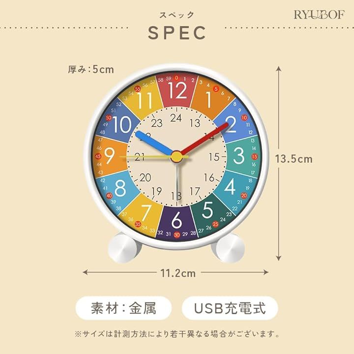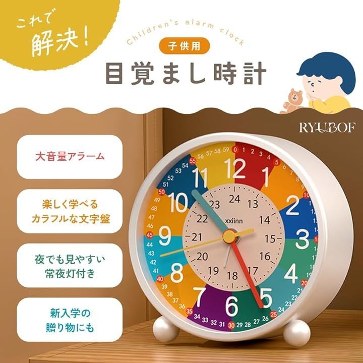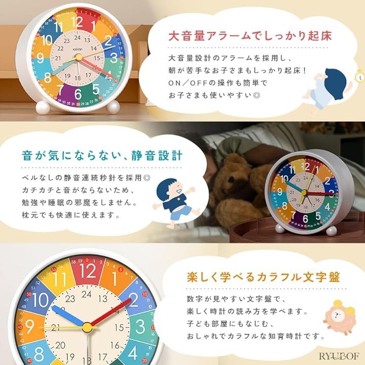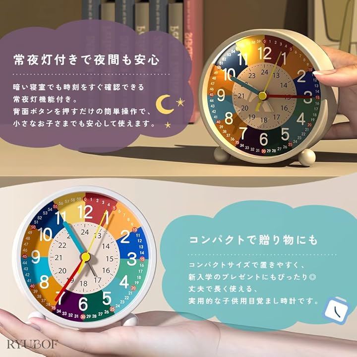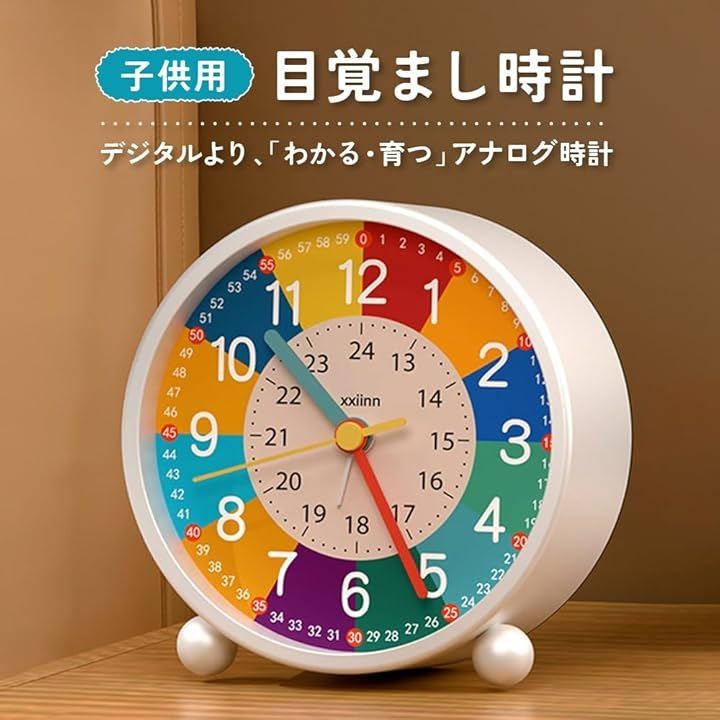 目覚まし時計 子供用 大音量 アナログ 学習時計 おしゃれ カラフル キッズ 置時計 常夜灯付き 静音 ベルなし コンパクト 知育玩具 入学祝い プレゼント