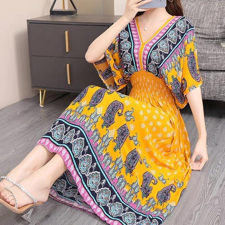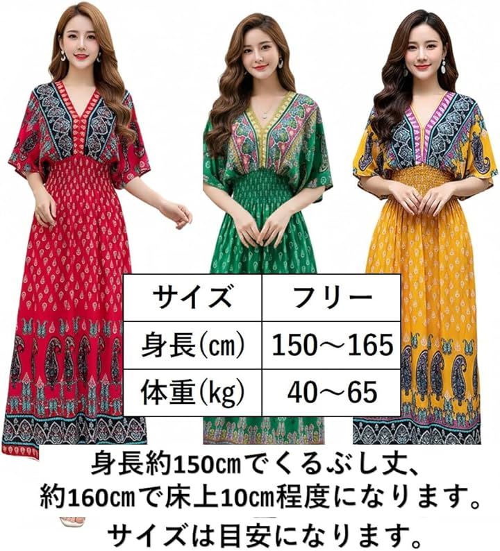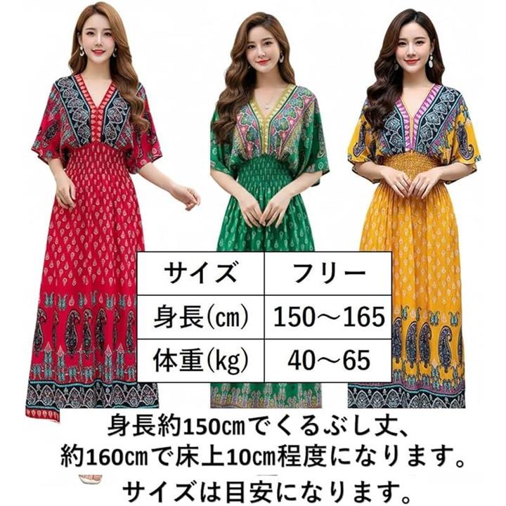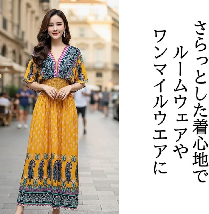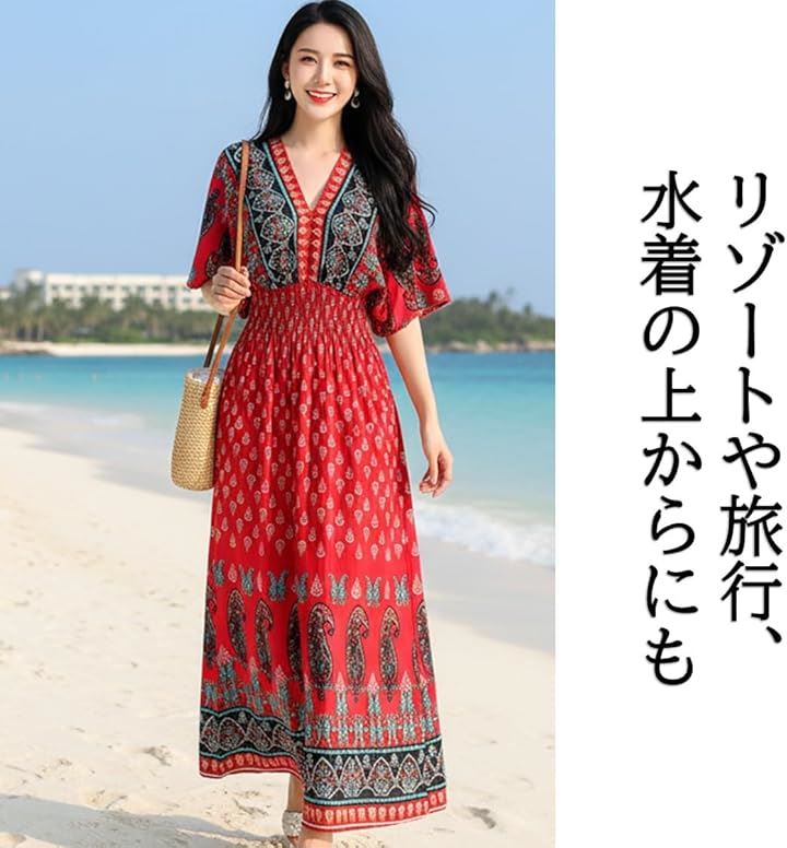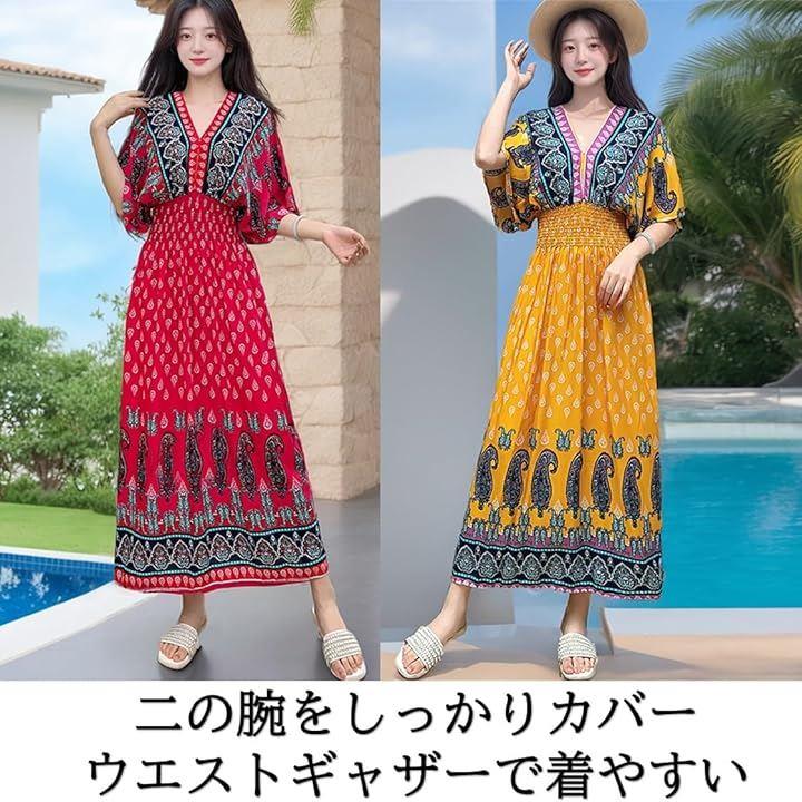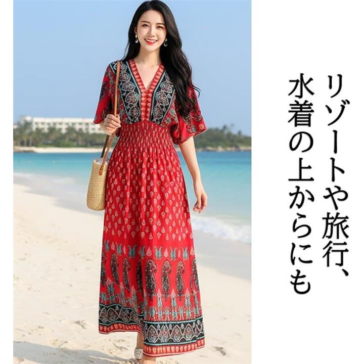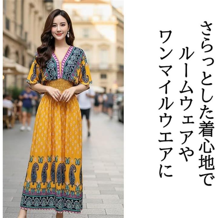 ワンピース レディース 夏 半袖 ゆったり ロング 涼しげ リラックス エスニック 体型カバー リゾート 海 旅行 フリーサイズ