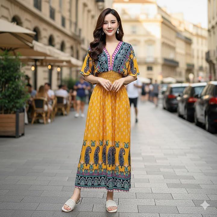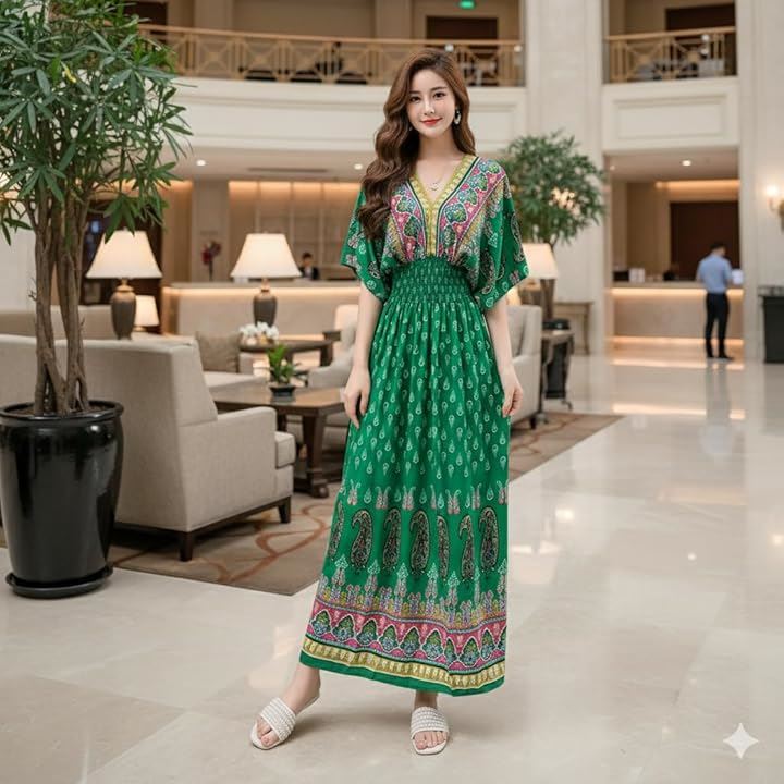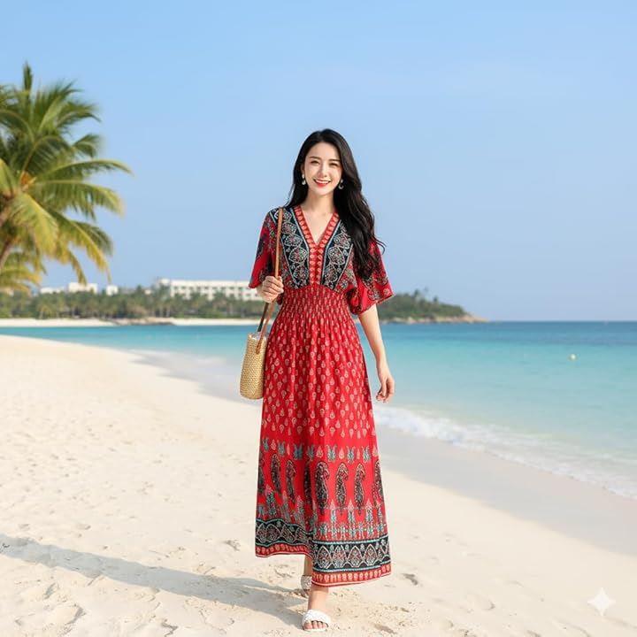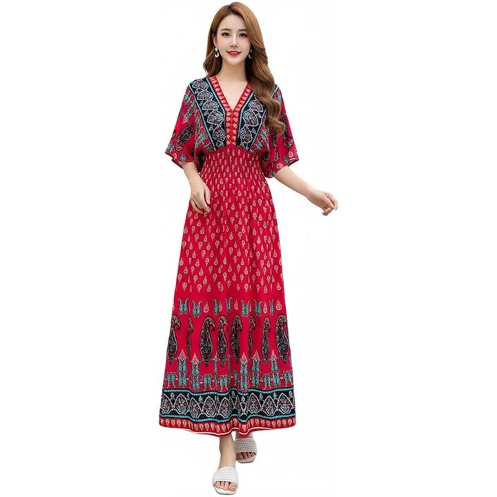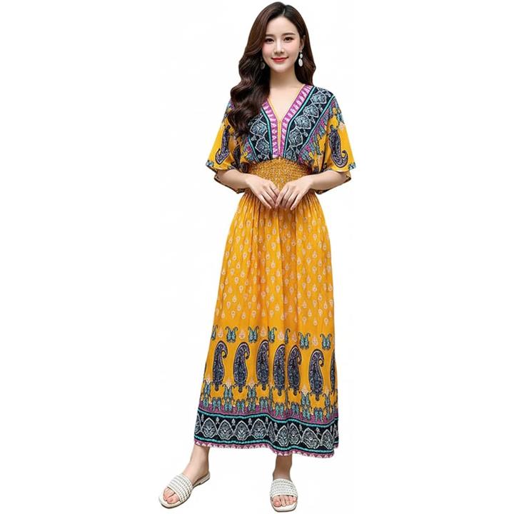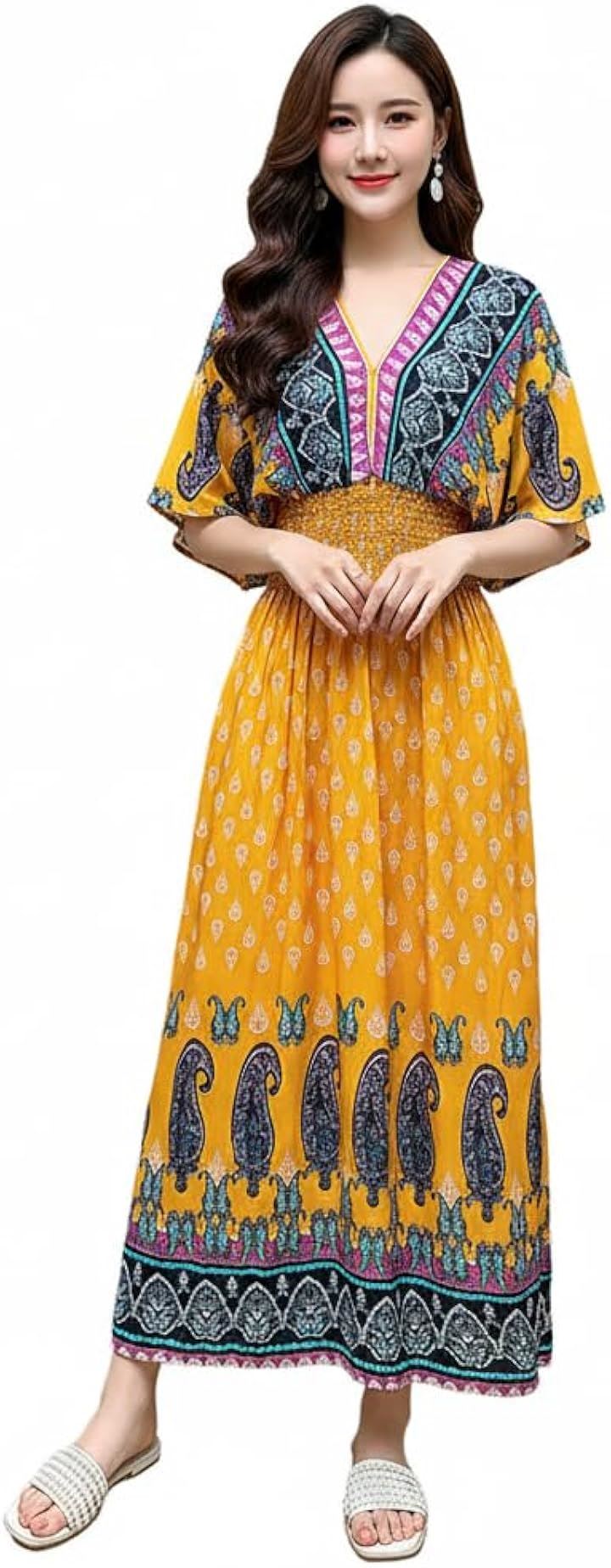ワンピース レディース 夏 半袖 ゆったり ロング 涼しげ リラックス エスニック 体型カバー リゾート 海 旅行 フリーサイズ