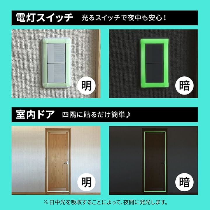 例えば、壁に貼って夜中の目印にしたり、ガラスに貼って安全対策に使ったりできます