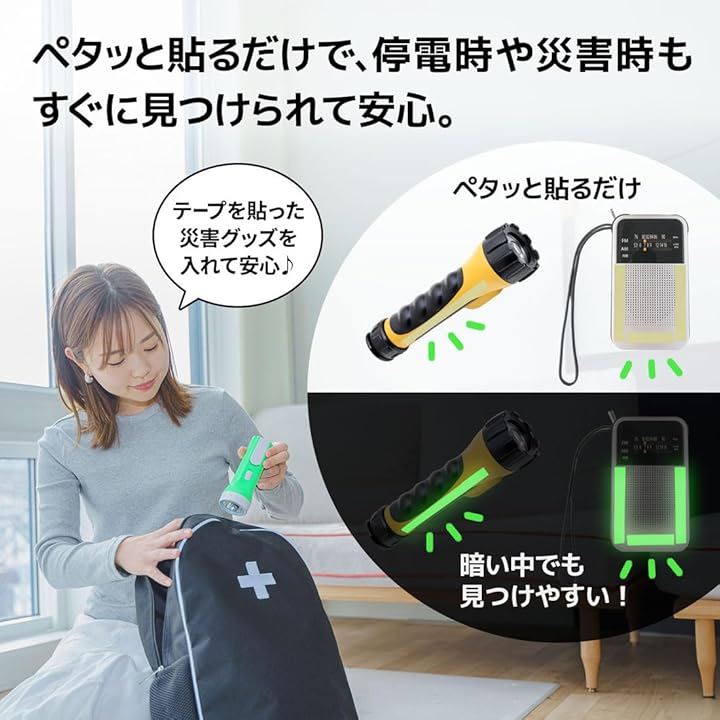 「ペタッと貼るだけで安心。防災対策に最適な光るテープ」 「いざという時に防災用品が見つからなくて困ったことはありませんか?」停電時や災害時には、迅速に防災用品を見つけることが重要です。