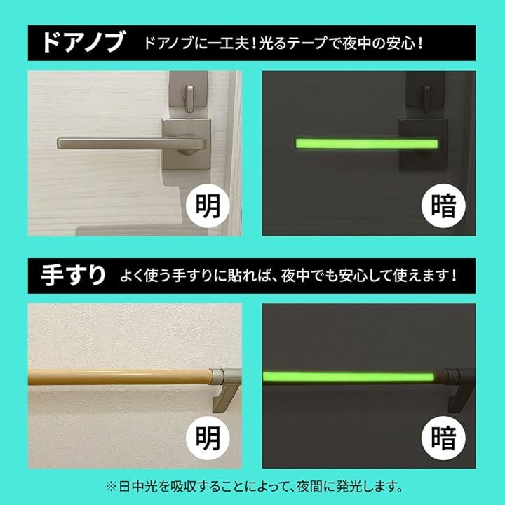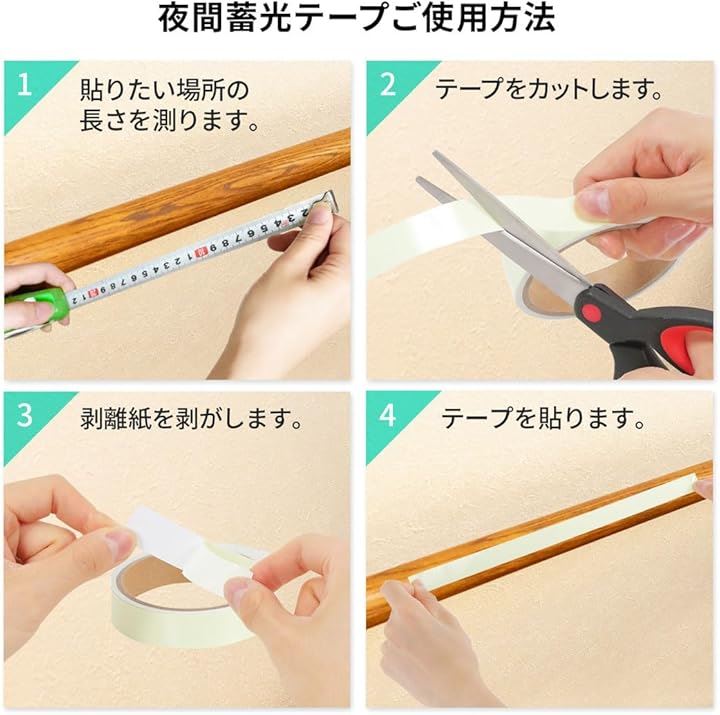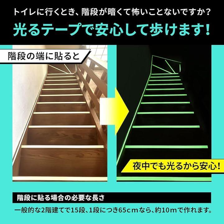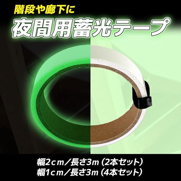 「暗闇でも安心。場所がすぐにわかる光るテープ」 「夜中に暗い場所で、つまずいたりしたことはありませんか?」この光るテープなら、その問題を解決します。