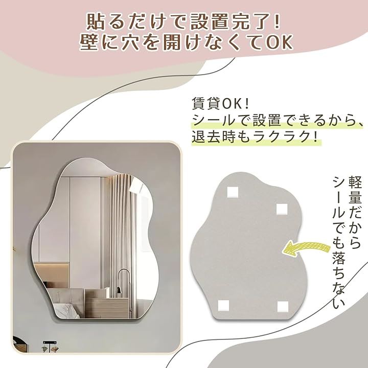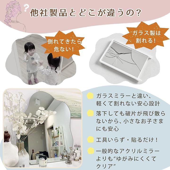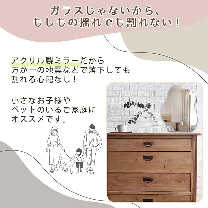 ウェーブミラー ウォールミラー 割れない鏡 壁 インテリア アクリル製 貼る鏡 全身鏡 姿見鏡 壁掛け スタンドミラー 軽量 化粧用 浴室用 安全ミラー