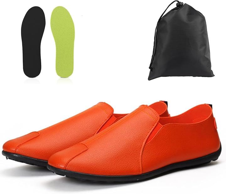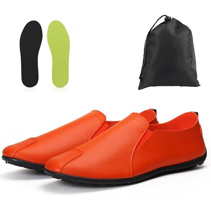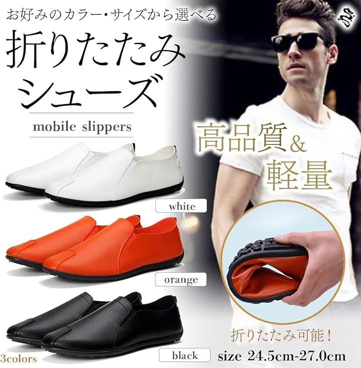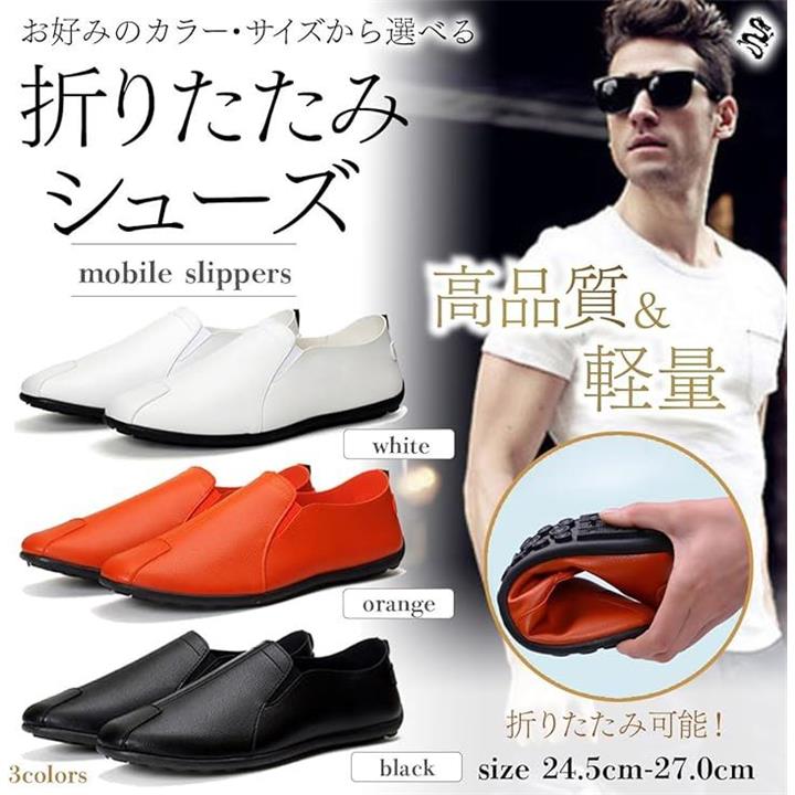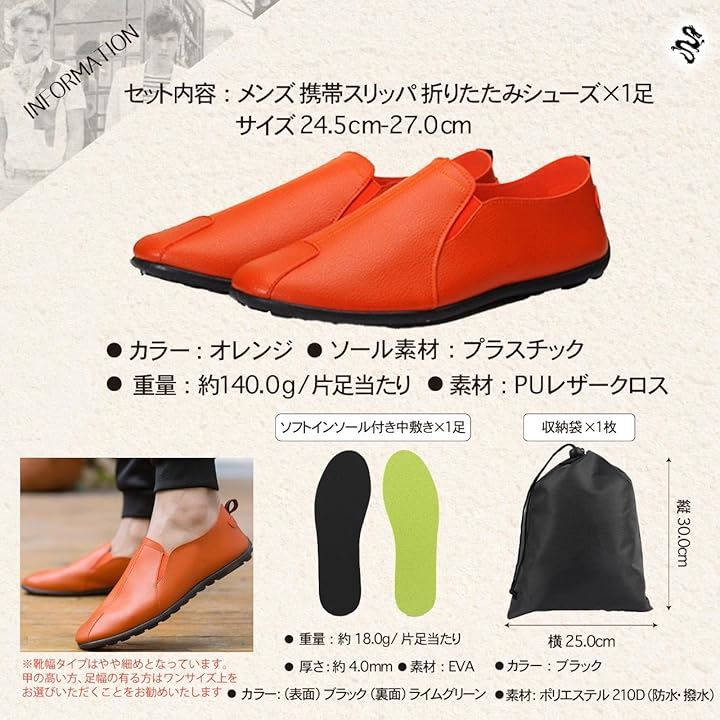 「商品仕様」セット内容:メンズ 携帯スリッパ 折りたたみシューズx1足 サイズ 24.5cm、25.0cm、25.5cm、26.0cm、26.5cm、27.0cm 重量:約140.0g/片足当たり 素材:PUレザー クロス(内面素材) カラー:ブラック、オレンジ、ホワイト、 ソフトインソール付き中敷きx1足 厚さ:約4.0mm 重量:約18.0g/片足当たり 素材:EVA カラー:(表面)ブラック (裏面)ライムグリーン 収納袋x1枚 サイズ 縦30.0cm 横25.0cm 素材:ポリエステル210D(防水・撥水) カラー:ブラック *靴幅タイプはやや細めとなっています。