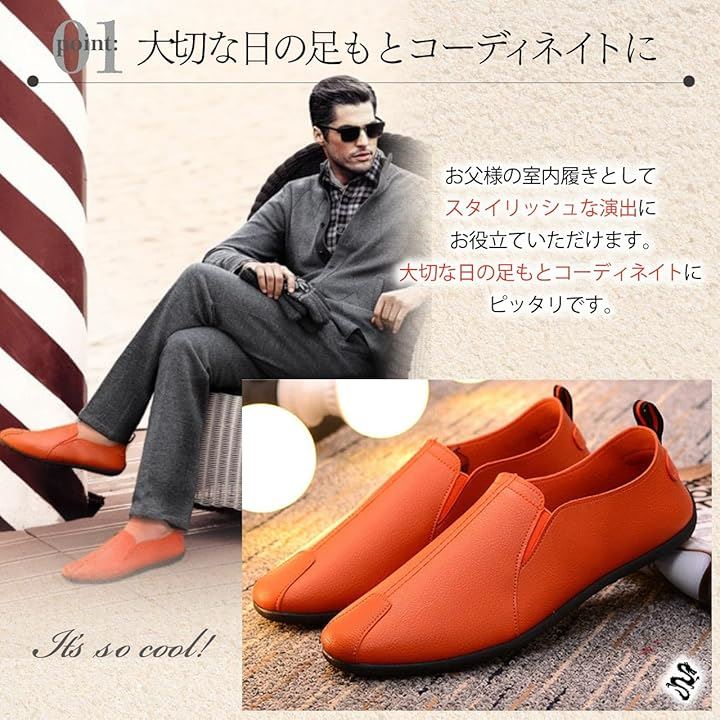 大切な日の足もとコーディネイトに:オフィスやドライブ、お子様の学校訪問・受験・面接、説明会など、お父様の室内履きとしてスタイリッシュな演出にお役立ていただけます。