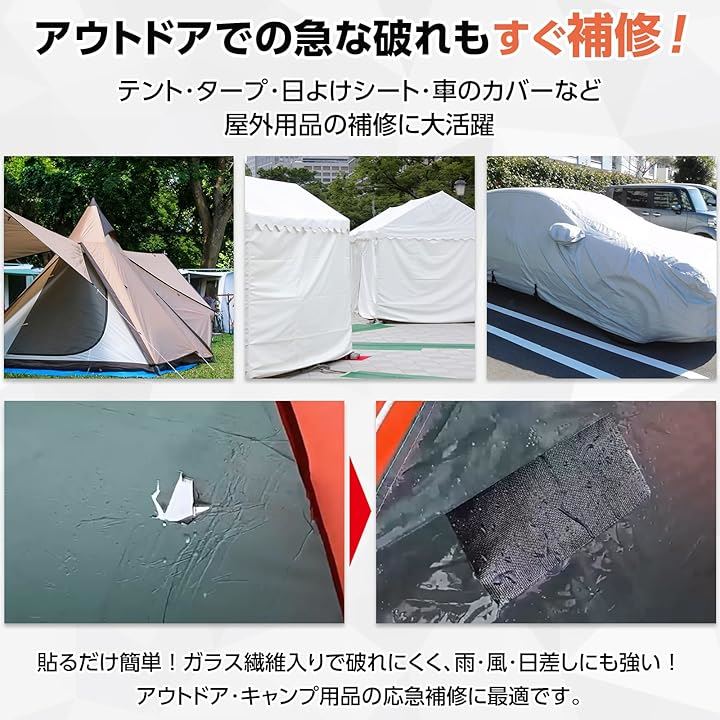 テントやタープの破れ、裂けた箇所に貼るだけで簡単に補修でき、強風や雨でも安心の密着力を発揮します。