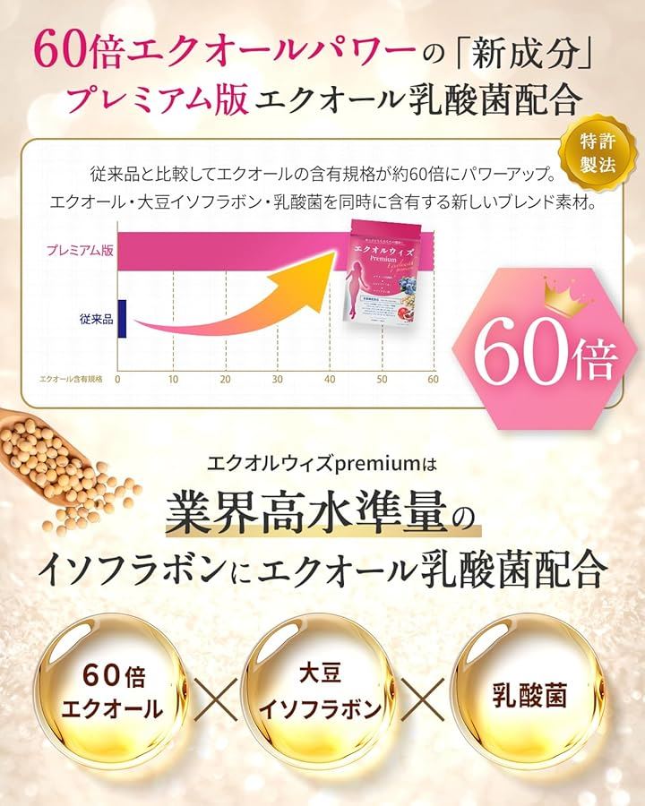 「60倍エクオールパワー成分を配合したサプリメント」高水準量のイソフラボンに贅沢エクオール乳酸菌配合。