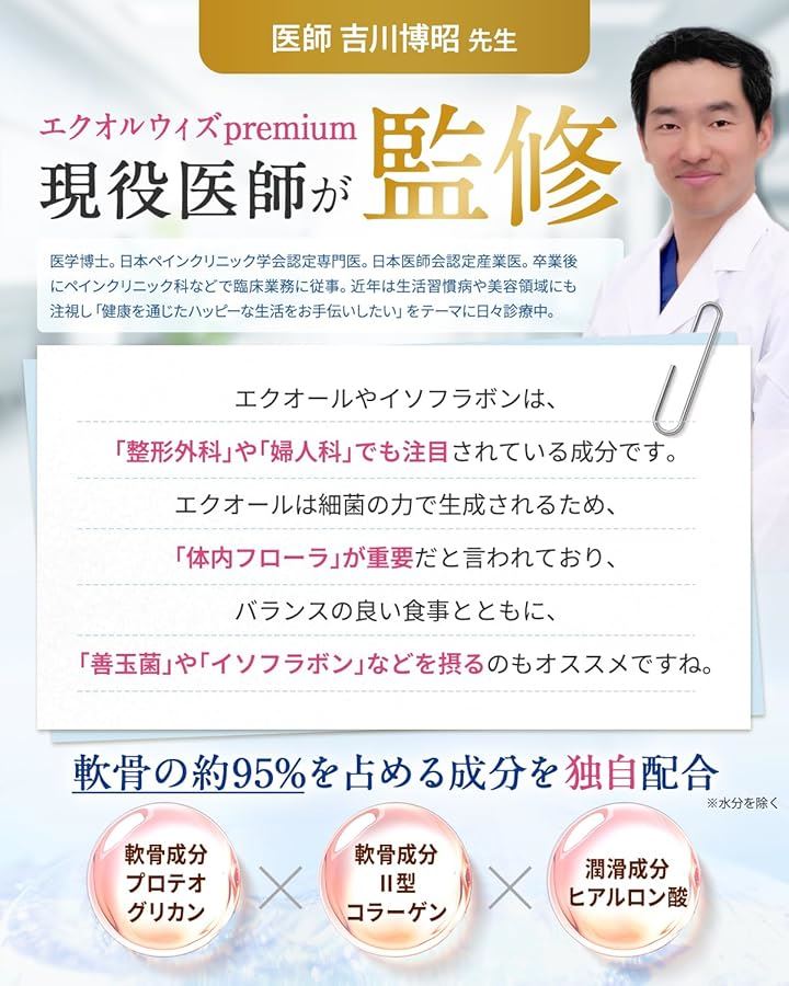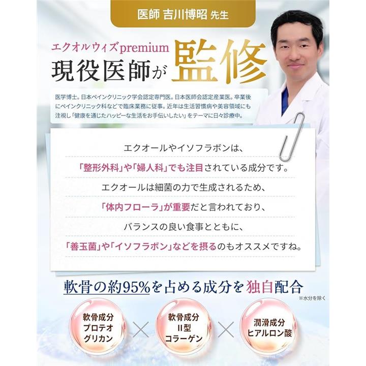 「エクオルウィズpremiumは現役医師が監修」「エクオールは整形外科や婦人科などで注目されている成分です」軟骨成分(プロテオグリカン、コラーゲン)や潤滑成分(ヒアルロン酸)などを独自配合。