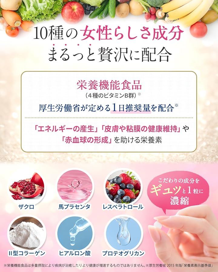 「原材料・成分」難消化性デキストリン(国内製造)、大豆抽出物、乳酸菌末(乳酸菌(殺菌)、デキストリン)(乳成分を含む)、エクオール乳酸菌発酵エキス含有粉末(乳酸菌発酵エキス(黒糖・大豆胚芽培地、乳酸菌)、梅エキス、デキストリン、海洋深層水)、乳糖発酵物(乳糖発酵液、乳糖)(乳成分を含む)、殺菌乳酸菌混合末(デキストリン、乳酸菌混合末、乳糖)(乳成分を含む)、イソマルトオリゴ糖、イヌリン、プロテオグリカン含有サケ鼻軟骨抽出物(デキストリン、サケ鼻軟骨抽出物)(サケを含む)、鶏軟骨抽出物(ゼラチンを含む)、ザクロ果汁粉末(デキストリン、ザクロ果汁)、レスベラトロール含有赤ワインエキス末、馬プラセンタエキス末/セルロース、ステアリン酸カルシウム、微粒酸化ケイ素、ビタミンB2、ビタミンB6、ビタミンB1、ヒアルロン酸、ビタミンB12ビタミンB12