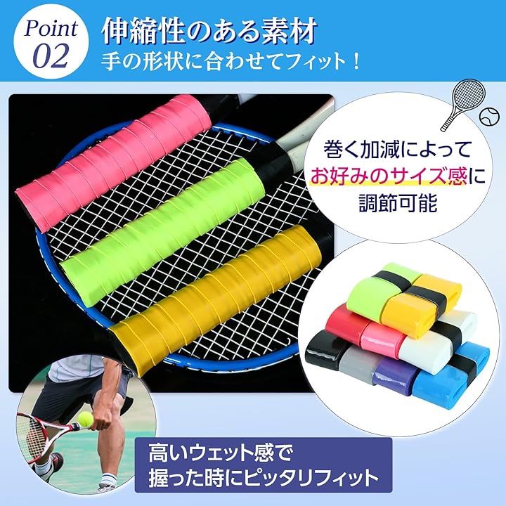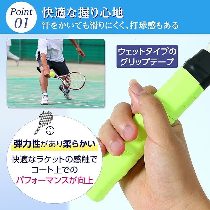汗をかくシーンでも安心してプレイに集中できる、ウェットタイプのグリップテープです。