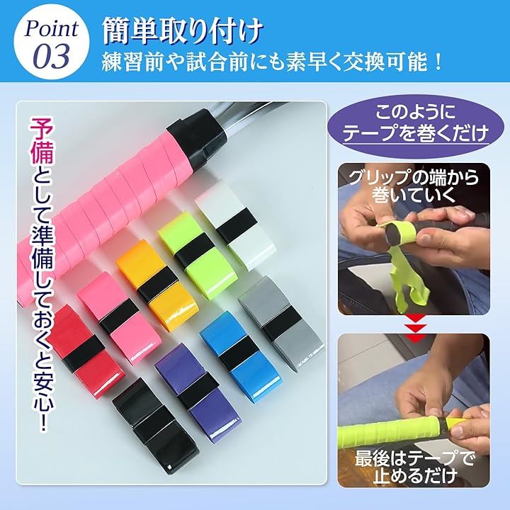 取り付けが簡単で、試合や練習前の忙しい時間でも素早く交換が可能な利便性の高いグリップテープです。