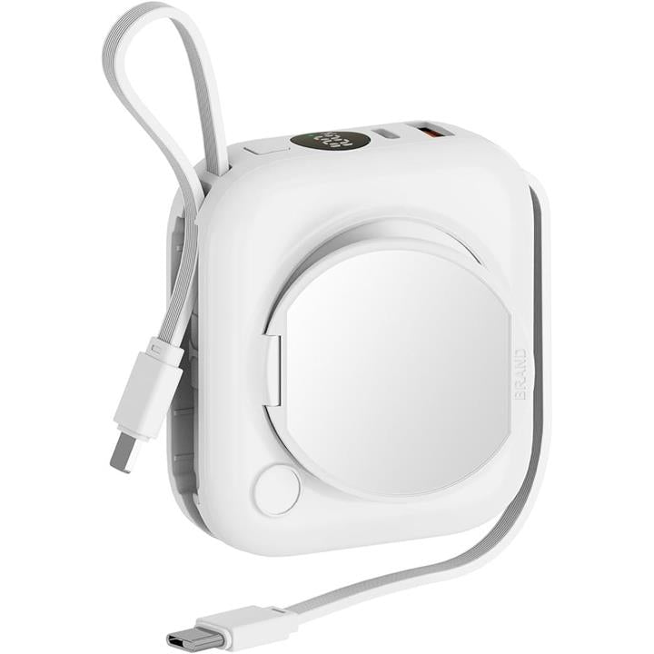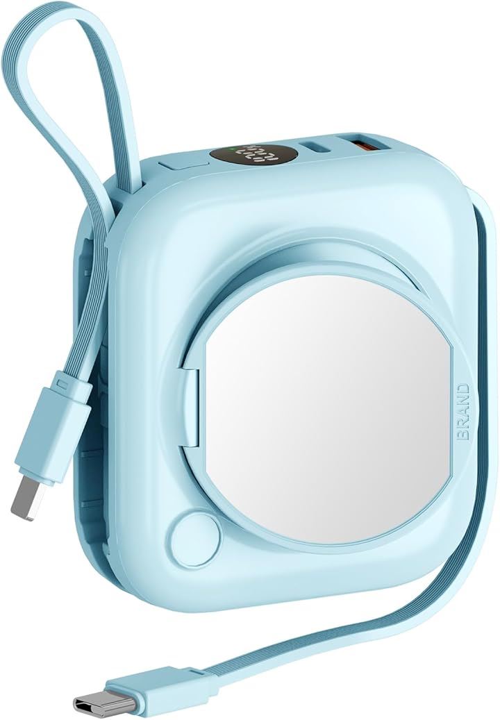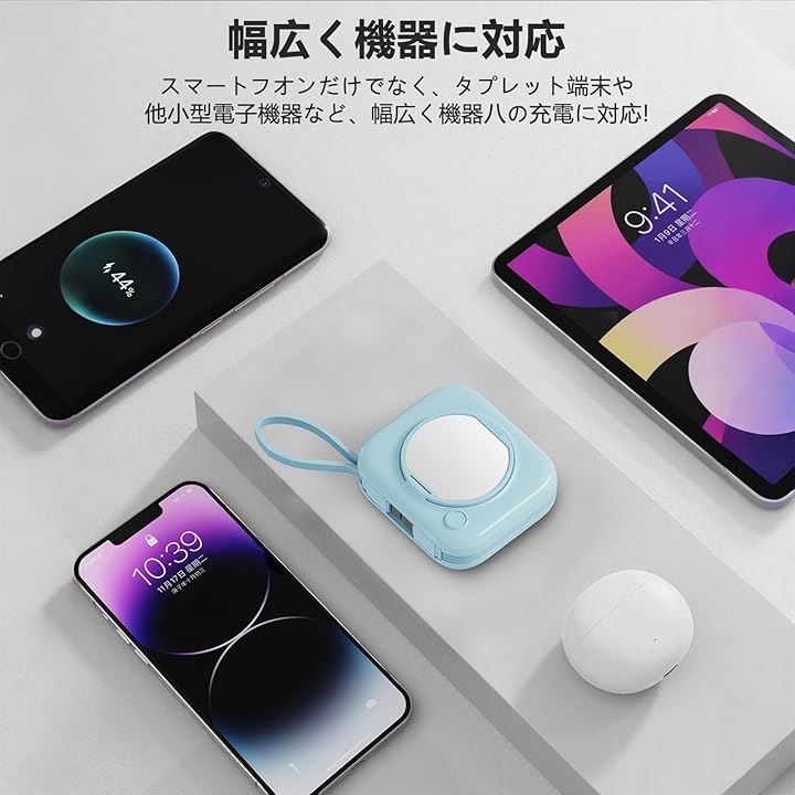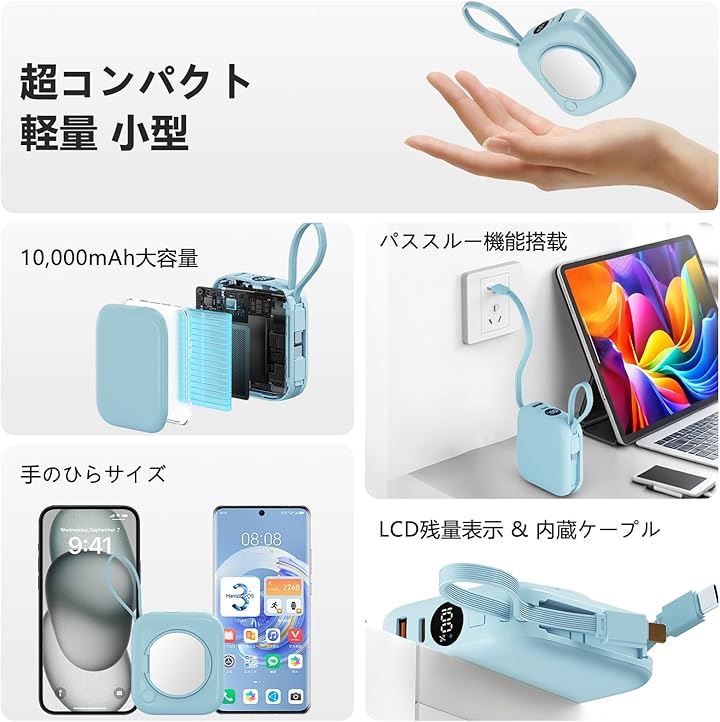 片手で持てる軽さだから、移動中や立ちながらの充電もストレスフリー。 「戦略的なデュアルケーブル内蔵」 * Lightningケーブル:iPhone 14以前の全機種に直接接続(12.5W高速充電) * Type-Cケーブル:iPhone15/16&最新Android端末対応(PD18W超高速充電) *収納式デザインでケーブルの絡みつき防止。使用時は引き出し、不使用時はスッキリ収納 「女性に嬉しい2大機能」 ✓ 精密LCDディスプレイ:残量%表示/充電状態をリアルタイム確認 ✓ 折りたたみ式コンパクトミラー:メイク直しに最適な角度調整可能設計 > 母の日・バレンタインなど「実用的な贈り物」上位候補。 「プロ仕様の充電性能」 * 10000mAh大容量: ・iPhone16:約1.8回満充電 ・Galaxy S24:約1.5回満充電 ・iPad mini:約1.3回充電 * 3台同時充電システム: USB-Cポート(入力のみ可能) USB-Aポート 内蔵Type-Cケーブル 内蔵Lightningケーブル *パススルー充電対応:バッテリー本体充電中でも端末への給電可能 「グローバル対応&航空機持ち込み可」 ・世界対応電圧(100-240V) ・IATA規定準拠の容量設計 ・機内持ち込み可能なリチウムポリマー電池採用 「安心の日本品質」 ◉ PSE認証済み(電気用品安全法基準クリア) ◉ 6大安全保護:過充電/過放電/過電流/過電圧/短絡/過熱保護 *こんな方に最適* ✓ 少ない荷物で旅行したい ✓ 複数端末を同時管理するビジネスパーソン ✓ 美容意識の高い女性 ✓ 災害時の備えをコンパクトに確保したい方 ✓ 最新iPhone&Androidユーザー *ご注意:複数端末同時充電時は総合出力15Wに調整されます。