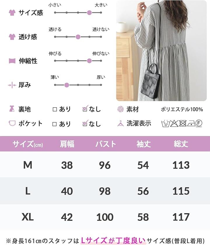 サイズ:肩幅/バスト/袖丈/総丈 「M」38/96/54/113 「L」40/98/56/115 「XL」42/100/58/117