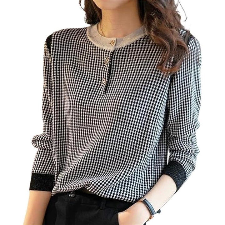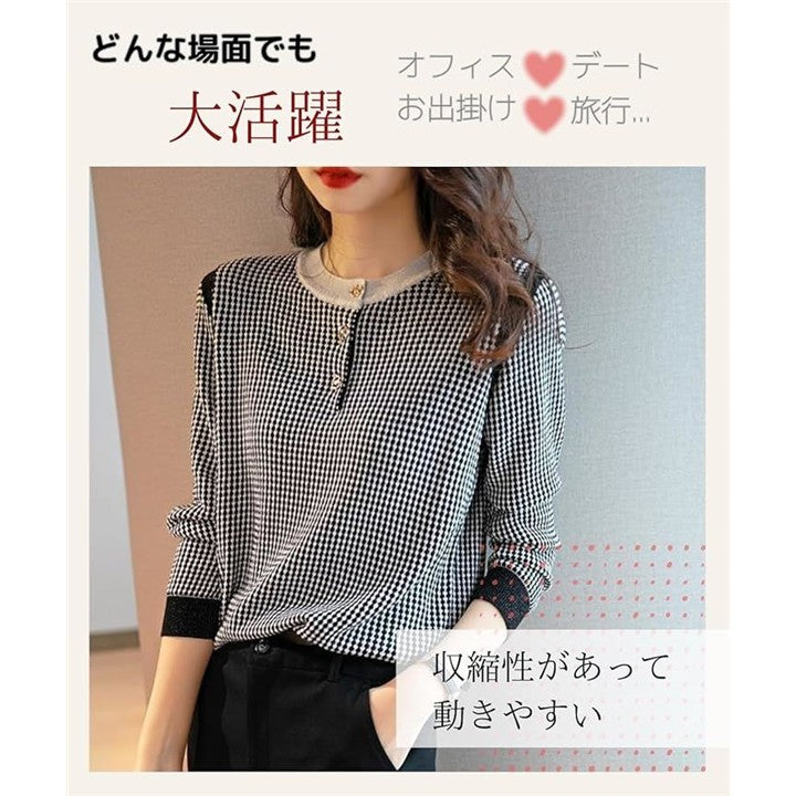 [Elixio] [エリクシオ] ニット トップス レディース 千鳥格子 薄手 長袖 ラウンドネック 金ボタン きれいめ 上品 おしゃれ 通勤 オフィスカジュアル 春 秋 |