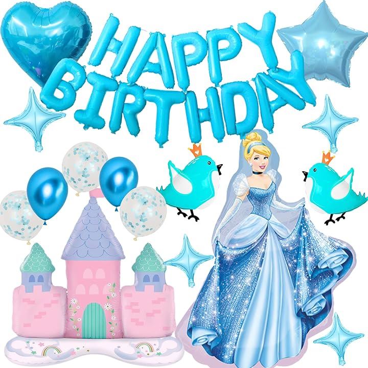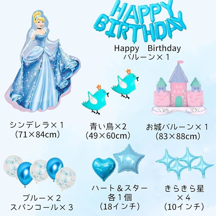 セット内容:シンデレラバルーン、青い鳥バルーンx2、スターバルーンx2、ハートバルーンx2、お城バルーン、キラキラ星バルーンx4、バースデーガーランド(ブルー)、光沢バルーンx2個、キラキラ紙吹雪バルーンx3
