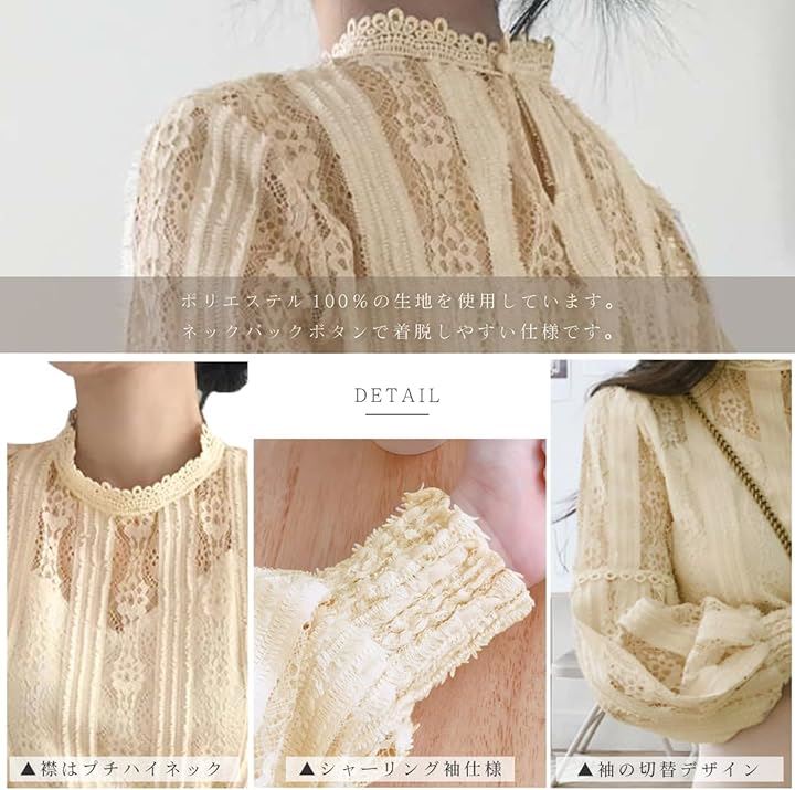総レースで2種類のレースで組み合わせてあるので、高見えするデザイン。プチハイネックになっているので、1枚でそのまま着ても、スウェットやニットの下にレイヤードスタイルとして使うこともできます。