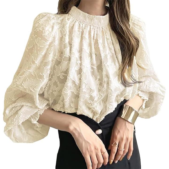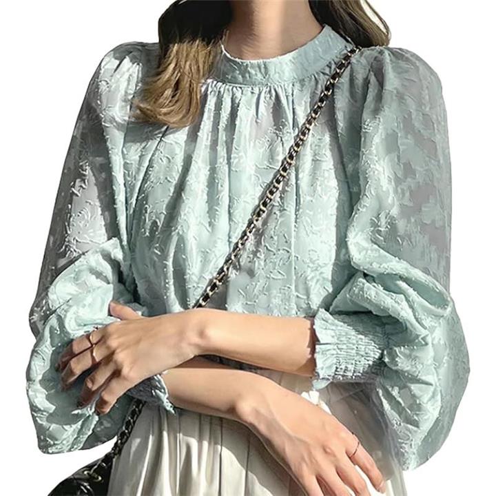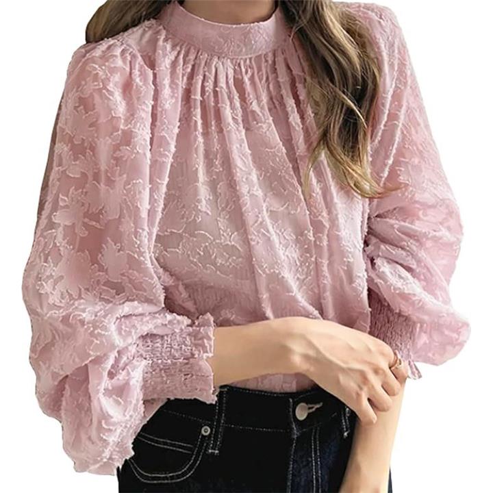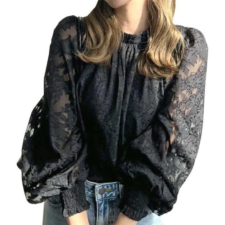 見た目から、ふわっとやわらかな生地感が女性らしい印象のレース刺繍ロングスリーブブラウス。